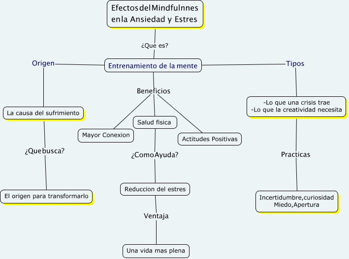 Este Cmap, tiene información relacionada con: Mapa conceptual Origen del Mindfulnnes, -Lo que una crisis trae -Lo que la creatividad necesita Practicas Incertidumbre,curiosidad Miedo,Apertura, Entrenamiento de la mente Tipos -Lo que una crisis trae -Lo que la creatividad necesita, Entrenamiento de la mente Beneficios Salud fisica, Entrenamiento de la mente Beneficios Mayor Conexion, Salud fisica ¿Como Ayuda? Reduccion del estres, Reduccion del estres Ventaja Una vida mas plena, Entrenamiento de la mente Beneficios Actitudes Positivas, La causa del sufrimiento ¿Que busca? El origen para transformarlo, Entrenamiento de la mente Origen La causa del sufrimiento, Efectos del Mindfulnnes en la Ansiedad y Estres ¿Que es? Entrenamiento de la mente