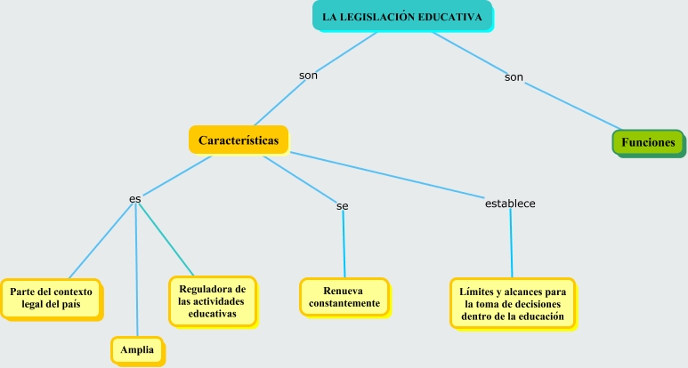 Este Cmap, tiene información relacionada con: Características y funciones de la legislación educativa, LA LEGISLACIÓN EDUCATIVA son Características, LA LEGISLACIÓN EDUCATIVA son Funciones, Características es Parte del contexto legal del país, Características es Reguladora de las actividades educativas, Características se Renueva constantemente, Características es Amplia, Características establece Límites y alcances para la toma de decisiones dentro de la educación
