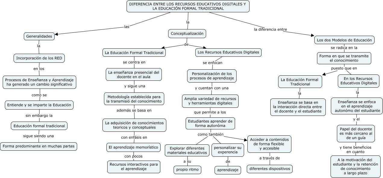 Este Cmap, tiene información relacionada con: Diferencia entre EDUCACIÓN TRADICIONAL Y RED, Personalización de los procesos de aprendizaje y cuentan con una Amplia variedad de recursos y herramientas digitales, Enseñanza se enfoca en el aprendizaje autonómo del estudiante y el Papel del docente es más cercano al de un guía, Entiende y se imparte la Educación sin embargo la Educación formal tradicional, Incorporación de los RED en los Procesos de Enseñanza y Aprendizaje ha generado un cambio significativo, Conceptualización de Los Recursos Educativos Digitales, Estudiantes aprender de forma autonóma como también Explorar diferentes materiales educativos, Metodología establecida para la transmisió del conocimiento además se basa en La adquisición de conocimientos teoricos y conceptuales, Explorar diferentes materiales educativos a su propio ritmo, Estudiantes aprender de forma autonóma como también personalizar su experencia, DIFERENCIA ENTRE LOS RECURSOS EDUCATIVOS DIGITALES Y LA EDUCACIÓN FORMAL TRADICIONAL la diferencia entre Los dos Modelos de Educación, La adquisición de conocimientos teoricos y conceptuales con enfásis en El aprendizaje memorístico, Los dos Modelos de Educación se radica en la Forma en que se transmite el conocimiento, Acceder a contenidos de forma flexible y accesible a través de diferentes dispositivos, Los Recursos Educativos Digitales se enfocan Personalización de los procesos de aprendizaje, DIFERENCIA ENTRE LOS RECURSOS EDUCATIVOS DIGITALES Y LA EDUCACIÓN FORMAL TRADICIONAL la Conceptualización, Procesos de Enseñanza y Aprendizaje ha generado un cambio significativo como se Entiende y se imparte la Educación, En los Recursos Educativos Digitales la Enseñanza se enfoca en el aprendizaje autonómo del estudiante, DIFERENCIA ENTRE LOS RECURSOS EDUCATIVOS DIGITALES Y LA EDUCACIÓN FORMAL TRADICIONAL las Generalidades, Amplia variedad de recursos y herramientas digitales que permite a los Estudiantes aprender de forma autonóma, El aprendizaje memorístico con pocos Recursos interactivos para el aprendizaje
