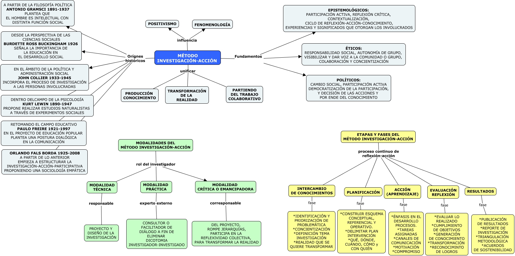 Este Cmap, tiene información relacionada con: MÉTODO INVESTIGACIÓN-ACCIÓN, ACCIÓN (APRENDIZAJE) fase *ÉNFASIS EN EL DESARROLLO PROCESOS. *TAREAS ASIGNADAS *CANALES DE COMUNICACIÓN *MOTIVACIÓN *COMPROMISO, EVALUACIÓN REFLEXIÓN fase *EVALUAR LO REALIZADO *CUMPLIMIENTO DE OBJETIVOS *GENERACIÓN DE CONOCIMIENTO *TRANSFORMACIÓN *RECONOCIMINTO DE LOGROS, MÉTODO INVESTIGACIÓN-ACCIÓN influencia FENOMENOLOGÍA, MÉTODO INVESTIGACIÓN-ACCIÓN Fundamentos ÉTICOS: RESPONSABILIDAD SOCIAL, AUTONOMÍA DE GRUPO, VISIBILIZAR Y DAR VOZ A LA COMUNIDAD O GRUPO, COLABORACIÓN Y CONCIENTIZACIÓN, MÉTODO INVESTIGACIÓN-ACCIÓN Orígnes históricos DENTRO DELCAMPO DE LA PSICOLOGÍA KURT LEWIN 1890-1947 PROPONE REALIZAR ESTUDIOS NATURALISTAS A TRAVÉS DE EXPERIMENTOS SOCIALES, MÉTODO INVESTIGACIÓN-ACCIÓN unificar PARTIENDO DEL TRABAJO COLABORATIVO, MODALIDADES DEL MÉTODO INVESTIGACIÓN-ACCIÓN rol del investigador MODALIDAD TÉCNICA, ETAPAS Y FASES DEL MÉTODO INVESTIGACIÓN-ACCIÓN proceso continuo de reflexión-acción EVALUACIÓN REFLEXIÓN, MODALIDAD PRÁCTICA experto externo CONSULTOR O FACILITADOR DE DIÁLOGO A FIN DE ELIMINAR DICOTOMIA INVESTIGADOR-INVESTIGADO, PLANIFICACIÓN fase *CONSTRUIR ESQUEMA CONCEPTUAL, REFERENCIAL Y OPERATIVO. *DELIMITAR PLAN INTERVENCIÓN *QUÉ, DÓNDE, CUÁNDO, CÓMO y CON QUIÉN, MÉTODO INVESTIGACIÓN-ACCIÓN influencia POSITIVISMO, ETAPAS Y FASES DEL MÉTODO INVESTIGACIÓN-ACCIÓN proceso continuo de reflexión-acción RESULTADOS, MÉTODO INVESTIGACIÓN-ACCIÓN unificar TRANSFORMACIÓN DE LA REALIDAD, MODALIDADES DEL MÉTODO INVESTIGACIÓN-ACCIÓN rol del investigador MODALIDAD PRÁCTICA, ETAPAS Y FASES DEL MÉTODO INVESTIGACIÓN-ACCIÓN proceso continuo de reflexión-acción INTERCAMBIO DE CONOCIMIENTOS, MODALIDAD TÉCNICA responsable PROYECTO Y DISEÑO DE LA INVESTIGACIÓN, MÉTODO INVESTIGACIÓN-ACCIÓN Orígnes históricos RETOMANDO EL CAMPO EDUCATIVO PAULO FREIRE 1921-1997 EN EL PROYECTO DE EDUCACIÓN POPULAR PLANTEA UNA POSTURA DIALÓGICA EN LA COMUNICACIÓN, MÉTODO INVESTIGACIÓN-ACCIÓN Orígnes históricos A PARTIR DE LA FILOSOFÍA POLÍTICA ANTONIO GRAMSCI 1891-1937 PLANTEA QUE EL HOMBRE ES INTELECTUAL CON DISTINTA FUNCIÓN SOCIAL, MÉTODO INVESTIGACIÓN-ACCIÓN Orígnes históricos DESDE LA PERSPECTIVA DE LAS CIENCIAS SOCIALES BURDETTE ROSS BUCKINGHAM 1926 SEÑALA LA IMPORTANCIA DE LA EDUCACIÓN EN EL DESARROLLO SOCIAL, MÉTODO INVESTIGACIÓN-ACCIÓN Fundamentos EPISTEMOLÓGICOS: PARTICIPACIÓN ACTIVA, REFLEXIÓN CRÍTICA, CONTEXTUALIZACIÓN, CICLO DE REFLEXIÓN-ACCIÓN-CONOCIMIENTO, EXPERIENCIAS Y SIGNIFICADOS QUE OTORGAN LOS INVOLUCRADOS