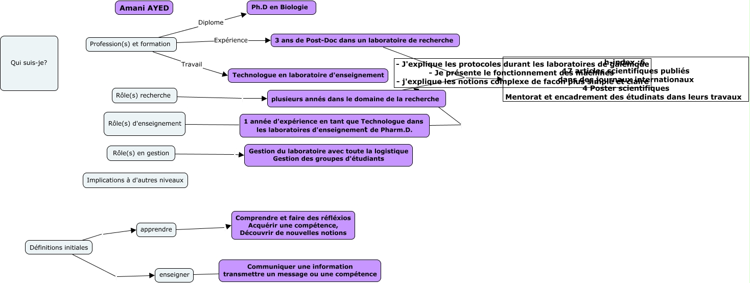 Cette carte de concepts créée avec IHMC CmapTools traite de: Amani AYED, enseigner ???? Communiquer une information transmettre un message ou une compétence, plusieurs annés dans le domaine de la recherche h-index :6 17 articles scientifiques publiés dans des journaux internationaux 4 Poster scientifiques Mentorat et encadrement des étudinats dans leurs travaux, Rôle(s) d'enseignement 1 année d'expérience en tant que Technologue dans les laboratoires d'enseignement de Pharm.D., Profession(s) et formation Diplome Ph.D en Biologie, Profession(s) et formation Travail Technologue en laboratoire d'enseignement, 1 année d'expérience en tant que Technologue dans les laboratoires d'enseignement de Pharm.D. - J'explique les protocoles durant les laboratoires de galénique - Je présente le fonctionnement des machines - j'explique les notions complexe de facon plus simple et claire, Rôle(s) recherche plusieurs annés dans le domaine de la recherche, Profession(s) et formation Expérience 3 ans de Post-Doc dans un laboratoire de recherche, Rôle(s) en gestion Gestion du laboratoire avec toute la logistique Gestion des groupes d'étudiants, apprendre Comprendre et faire des réfléxios Acquérir une compétence, Découvrir de nouvelles notions, Définitions initiales apprendre, Définitions initiales enseigner, 3 ans de Post-Doc dans un laboratoire de recherche h-index :6 17 articles scientifiques publiés dans des journaux internationaux 4 Poster scientifiques Mentorat et encadrement des étudinats dans leurs travaux