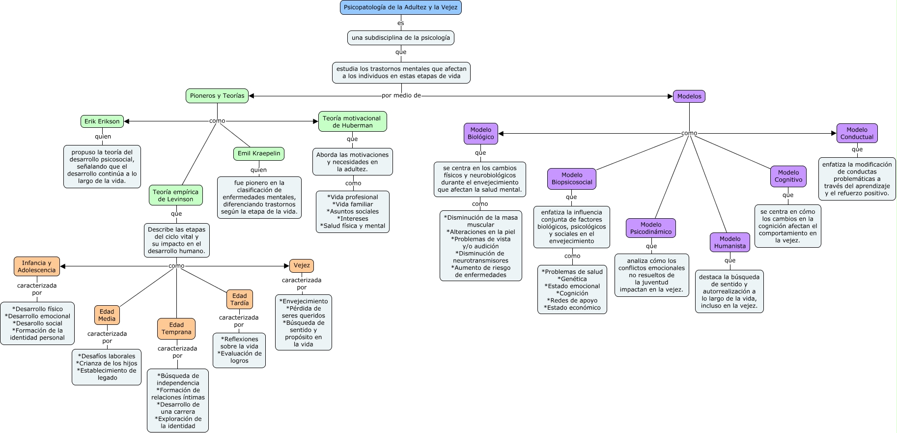 Este Cmap, tiene información relacionada con: Psicopatología Adultez y Vejez, Vejez caracterizada por *Envejecimiento *Pérdida de seres queridos *Búsqueda de sentido y propósito en la vida, se centra en los cambios físicos y neurobiológicos durante el envejecimiento que afectan la salud mental. como *Disminución de la masa muscular *Alteraciones en la piel *Problemas de vista y/o audición *Disminución de neurotransmisores *Aumento de riesgo de enfermedades, Teoría motivacional de Huberman que Aborda las motivaciones y necesidades en la adultez., Modelos como Modelo Conductual, Describe las etapas del ciclo vital y su impacto en el desarrollo humano. como Vejez, Modelos como Modelo Biopsicosocial, Pioneros y Teorías como Teoría empírica de Levinson, Modelo Biopsicosocial que enfatiza la influencia conjunta de factores biológicos, psicológicos y sociales en el envejecimiento, Psicopatología de la Adultez y la Vejez es una subdisciplina de la psicología, Describe las etapas del ciclo vital y su impacto en el desarrollo humano. como Infancia y Adolescencia, Infancia y Adolescencia caracterizada por *Desarrollo físico *Desarrollo emocional *Desarollo social *Formación de la identidad personal, Modelos como Modelo Humanista, Pioneros y Teorías como Teoría motivacional de Huberman, Aborda las motivaciones y necesidades en la adultez. como *Vida profesional *Vida familiar *Asuntos sociales *Intereses *Salud física y mental, una subdisciplina de la psicología que estudia los trastornos mentales que afectan a los individuos en estas etapas de vida, estudia los trastornos mentales que afectan a los individuos en estas etapas de vida por medio de Modelos, Modelo Psicodinámico que analiza cómo los conflictos emocionales no resueltos de la juventud impactan en la vejez., Edad Media caracterizada por *Desafíos laborales *Crianza de los hijos *Establecimiento de legado, Describe las etapas del ciclo vital y su impacto en el desarrollo humano. como Edad Temprana, enfatiza la influencia conjunta de factores biológicos, psicológicos y sociales en el envejecimiento como *Problemas de salud *Genética *Estado emocional *Cognición *Redes de apoyo *Estado económico