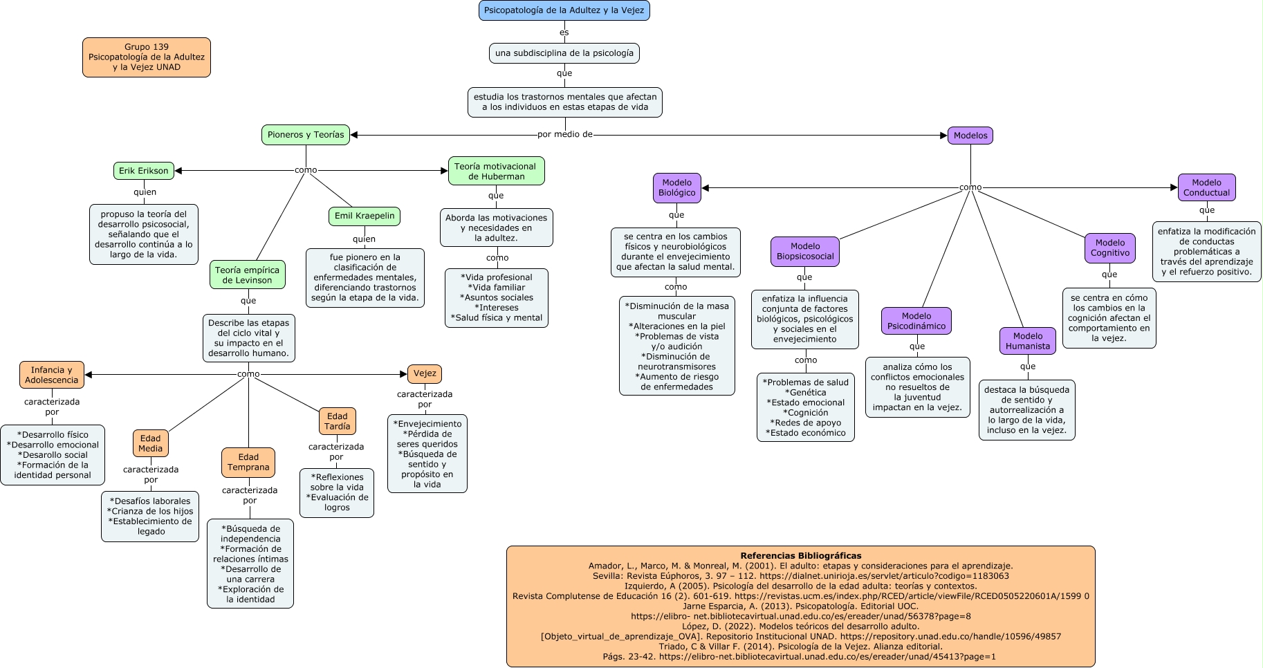 Este Cmap, tiene información relacionada con: Psicopatología Adultez y Vejez 139, Vejez caracterizada por *Envejecimiento *Pérdida de seres queridos *Búsqueda de sentido y propósito en la vida, se centra en los cambios físicos y neurobiológicos durante el envejecimiento que afectan la salud mental. como *Disminución de la masa muscular *Alteraciones en la piel *Problemas de vista y/o audición *Disminución de neurotransmisores *Aumento de riesgo de enfermedades, Teoría motivacional de Huberman que Aborda las motivaciones y necesidades en la adultez., Modelos como Modelo Conductual, Describe las etapas del ciclo vital y su impacto en el desarrollo humano. como Vejez, Modelos como Modelo Biopsicosocial, Pioneros y Teorías como Teoría empírica de Levinson, Modelo Biopsicosocial que enfatiza la influencia conjunta de factores biológicos, psicológicos y sociales en el envejecimiento, Psicopatología de la Adultez y la Vejez es una subdisciplina de la psicología, Describe las etapas del ciclo vital y su impacto en el desarrollo humano. como Infancia y Adolescencia, Infancia y Adolescencia caracterizada por *Desarrollo físico *Desarrollo emocional *Desarollo social *Formación de la identidad personal, Modelos como Modelo Humanista, Pioneros y Teorías como Teoría motivacional de Huberman, Aborda las motivaciones y necesidades en la adultez. como *Vida profesional *Vida familiar *Asuntos sociales *Intereses *Salud física y mental, una subdisciplina de la psicología que estudia los trastornos mentales que afectan a los individuos en estas etapas de vida, estudia los trastornos mentales que afectan a los individuos en estas etapas de vida por medio de Modelos, Modelo Psicodinámico que analiza cómo los conflictos emocionales no resueltos de la juventud impactan en la vejez., Edad Media caracterizada por *Desafíos laborales *Crianza de los hijos *Establecimiento de legado, Describe las etapas del ciclo vital y su impacto en el desarrollo humano. como Edad Temprana, enfatiza la influencia conjunta de factores biológicos, psicológicos y sociales en el envejecimiento como *Problemas de salud *Genética *Estado emocional *Cognición *Redes de apoyo *Estado económico