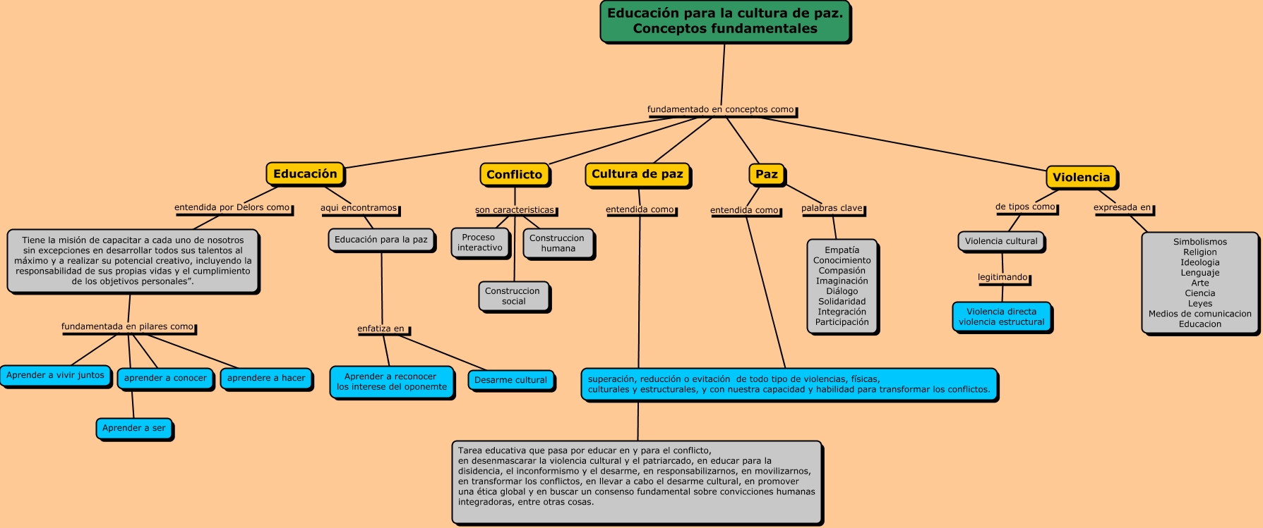 Este Cmap, tiene información relacionada con: Educacion para la cultura de paz. Conceptos fundamentales, Paz palabras clave Empatía Conocimiento Compasión Imaginación Diálogo Solidaridad Integración Participación, Educación para la cultura de paz. Conceptos fundamentales fundamentado en conceptos como Paz, Educación para la cultura de paz. Conceptos fundamentales fundamentado en conceptos como Educación, Educación entendida por Delors como Tiene la misión de capacitar a cada uno de nosotros sin excepciones en desarrollar todos sus talentos al máximo y a realizar su potencial creativo, incluyendo la responsabilidad de sus propias vidas y el cumplimiento de los objetivos personales”., Paz entendida como superación, reducción o evitación de todo tipo de violencias, físicas, culturales y estructurales, y con nuestra capacidad y habilidad para transformar los conflictos., Cultura de paz entendida como Tarea educativa que pasa por educar en y para el conflicto, en desenmascarar la violencia cultural y el patriarcado, en educar para la disidencia, el inconformismo y el desarme, en responsabilizarnos, en movilizarnos, en transformar los conflictos, en llevar a cabo el desarme cultural, en promover una ética global y en buscar un consenso fundamental sobre convicciones humanas integradoras, entre otras cosas., Educación para la paz enfatiza en Desarme cultural, Violencia expresada en Simbolismos Religion Ideologia Lenguaje Arte Ciencia Leyes Medios de comunicacion Educacion, Violencia cultural legitimando Violencia directa violencia estructural, Tiene la misión de capacitar a cada uno de nosotros sin excepciones en desarrollar todos sus talentos al máximo y a realizar su potencial creativo, incluyendo la responsabilidad de sus propias vidas y el cumplimiento de los objetivos personales”. fundamentada en pilares como Aprender a vivir juntos, Conflicto son caracteristicas Proceso interactivo, Tiene la misión de capacitar a cada uno de nosotros sin excepciones en desarrollar todos sus talentos al máximo y a realizar su potencial creativo, incluyendo la responsabilidad de sus propias vidas y el cumplimiento de los objetivos personales”. fundamentada en pilares como aprendere a hacer, Violencia de tipos como Violencia cultural, Conflicto son caracteristicas Construccion social, Tiene la misión de capacitar a cada uno de nosotros sin excepciones en desarrollar todos sus talentos al máximo y a realizar su potencial creativo, incluyendo la responsabilidad de sus propias vidas y el cumplimiento de los objetivos personales”. fundamentada en pilares como aprender a conocer, Educación para la paz enfatiza en Aprender a reconocer los interese del oponemte, Educación aqui encontramos Educación para la paz, Conflicto son caracteristicas Construccion humana, Educación para la cultura de paz. Conceptos fundamentales fundamentado en conceptos como Conflicto, Tiene la misión de capacitar a cada uno de nosotros sin excepciones en desarrollar todos sus talentos al máximo y a realizar su potencial creativo, incluyendo la responsabilidad de sus propias vidas y el cumplimiento de los objetivos personales”. fundamentada en pilares como Aprender a ser