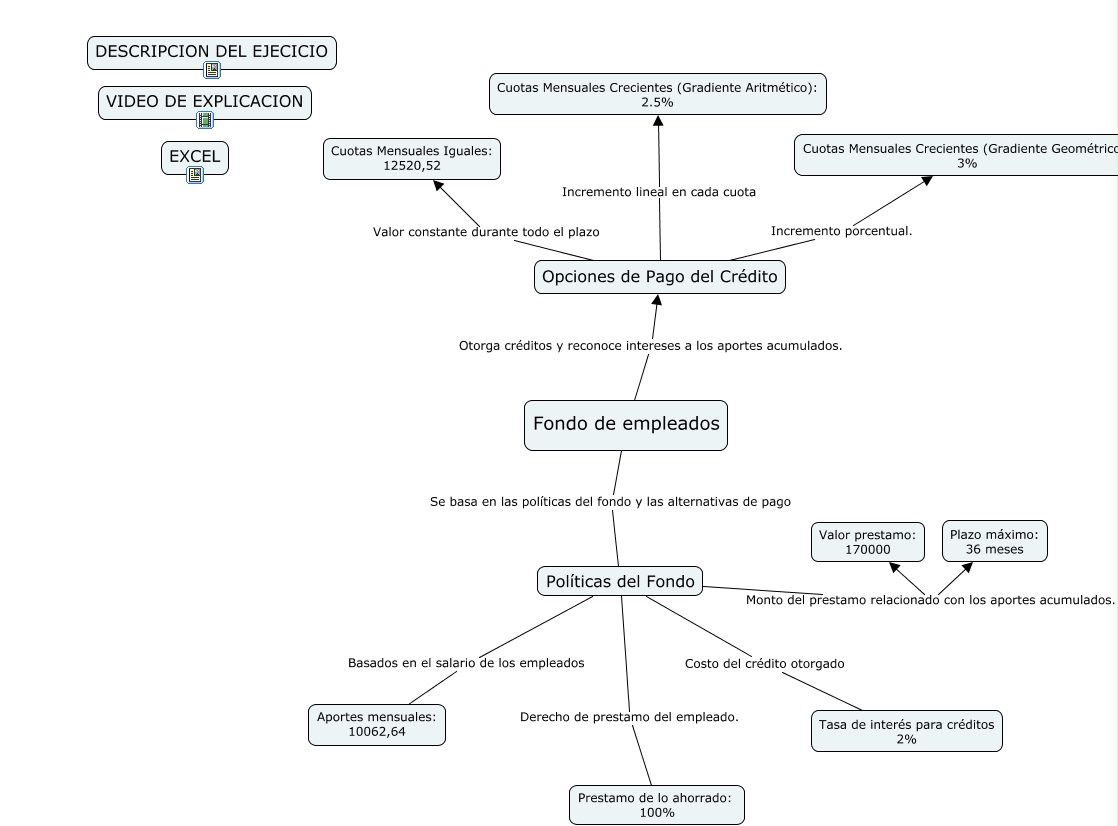 This Concept Map, created with IHMC CmapTools, has information related to: Cmap Fondo de empleados.cmap, Políticas del Fondo Costo del crédito otorgado Tasa de interés para créditos 2%, Opciones de Pago del Crédito Incremento porcentual. Cuotas Mensuales Crecientes (Gradiente Geométrico): 3%, Políticas del Fondo Derecho de prestamo del empleado. Prestamo de lo ahorrado: 100%, Opciones de Pago del Crédito Incremento lineal en cada cuota Cuotas Mensuales Crecientes (Gradiente Aritmético): 2.5%, Fondo de empleados Otorga créditos y reconoce intereses a los aportes acumulados. Opciones de Pago del Crédito, Políticas del Fondo Monto del prestamo relacionado con los aportes acumulados. Valor prestamo: 170000, Políticas del Fondo Monto del prestamo relacionado con los aportes acumulados. Plazo máximo: 36 meses, Políticas del Fondo Basados en el salario de los empleados Aportes mensuales: 10062,64, Fondo de empleados Se basa en las políticas del fondo y las alternativas de pago Políticas del Fondo, Opciones de Pago del Crédito Valor constante durante todo el plazo Cuotas Mensuales Iguales: 12520,52