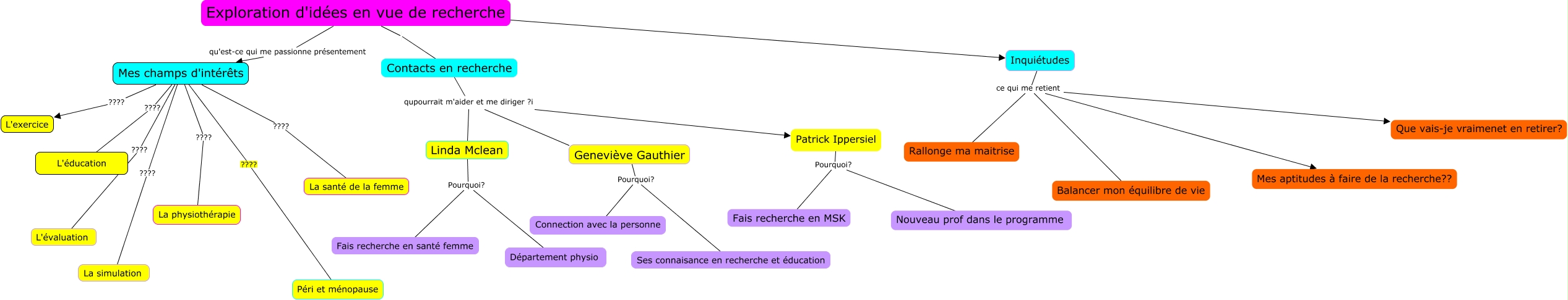 This Concept Map, created with IHMC CmapTools, has information related to: Untitled 1, Contacts en recherche qupourrait m'aider et me diriger ?i Geneviève Gauthier, Exploration d'idées en vue de recherche qu'est-ce qui me passionne présentement Mes champs d'intérêts, Linda Mclean Pourquoi? Fais recherche en santé femme, Exploration d'idées en vue de recherche ???? Inquiétudes, Mes champs d'intérêts ???? L'éducation, Geneviève Gauthier Pourquoi? Connection avec la personne, Contacts en recherche qupourrait m'aider et me diriger ?i Linda Mclean, Exploration d'idées en vue de recherche Contacts en recherche, Patrick Ippersiel Pourquoi? Nouveau prof dans le programme, Inquiétudes ce qui me retient Mes aptitudes à faire de la recherche??, Mes champs d'intérêts ???? Péri et ménopause, Patrick Ippersiel Pourquoi? Fais recherche en MSK, Mes champs d'intérêts ???? La physiothérapie, Geneviève Gauthier Pourquoi? Ses connaisance en recherche et éducation, Linda Mclean Pourquoi? Département physio, Inquiétudes ce qui me retient Que vais-je vraimenet en retirer?, Inquiétudes ce qui me retient Rallonge ma maitrise, Inquiétudes ce qui me retient Balancer mon équilibre de vie, Mes champs d'intérêts ???? La santé de la femme, Mes champs d'intérêts ???? La simulation