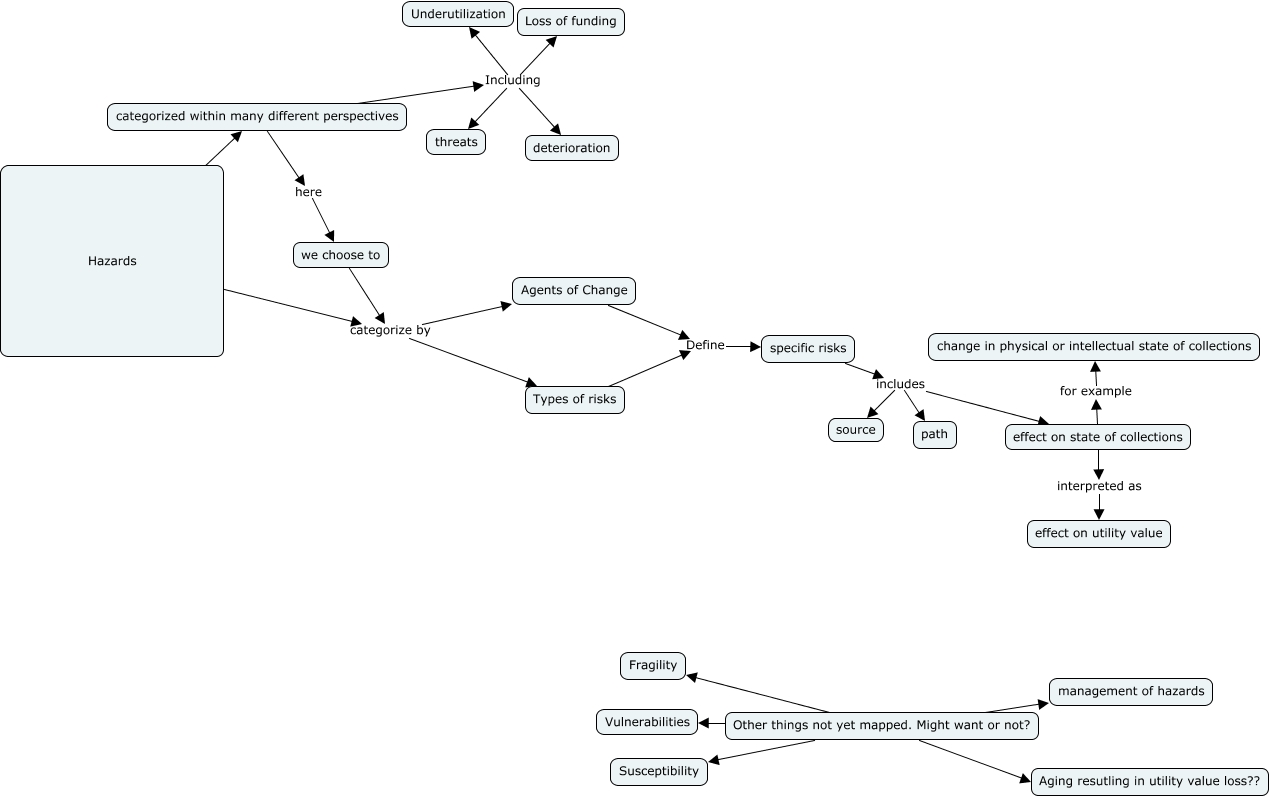 This Concept Map, created with IHMC CmapTools, has information related to: Hazard-Agent, categorized within many different perspectives Including deterioration, Other things not yet mapped. Might want or not? Fragility, Agents of Change Define specific risks, Hazards categorize by Agents of Change, specific risks includes effect on state of collections, effect on state of collections for example change in physical or intellectual state of collections, Types of risks Define specific risks, we choose to categorize by Agents of Change, specific risks includes path, we choose to categorize by Types of risks, Other things not yet mapped. Might want or not? Vulnerabilities, categorized within many different perspectives Including Loss of funding, specific risks includes source, effect on state of collections interpreted as effect on utility value, categorized within many different perspectives Including threats, Other things not yet mapped. Might want or not? Aging resutling in utility value loss??, Other things not yet mapped. Might want or not? management of hazards, categorized within many different perspectives here we choose to, Hazards can be categorized within many different perspectives, Hazards categorize by Types of risks