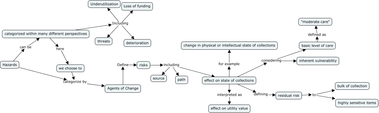 This Concept Map, created with IHMC CmapTools, has information related to: Hazard-Agent REVISED, categorized within many different perspectives Including Loss of funding, categorized within many different perspectives here we choose to, residual risk to highly sensitive items, categorized within many different perspectives Including threats, Hazards categorize by Agents of Change, risks including path, residual risk to bulk of collection, basic level of care defined as "moderate care", effect on state of collections considering inherent vulnerability, risks including effect on state of collections, effect on state of collections defining residual risk, Hazards can be categorized within many different perspectives, effect on state of collections interpreted as effect on utility value, risks including source, we choose to categorize by Agents of Change, effect on state of collections considering basic level of care, Agents of Change Define risks, categorized within many different perspectives Including Underutilization, effect on state of collections for example change in physical or intellectual state of collections, categorized within many different perspectives Including deterioration
