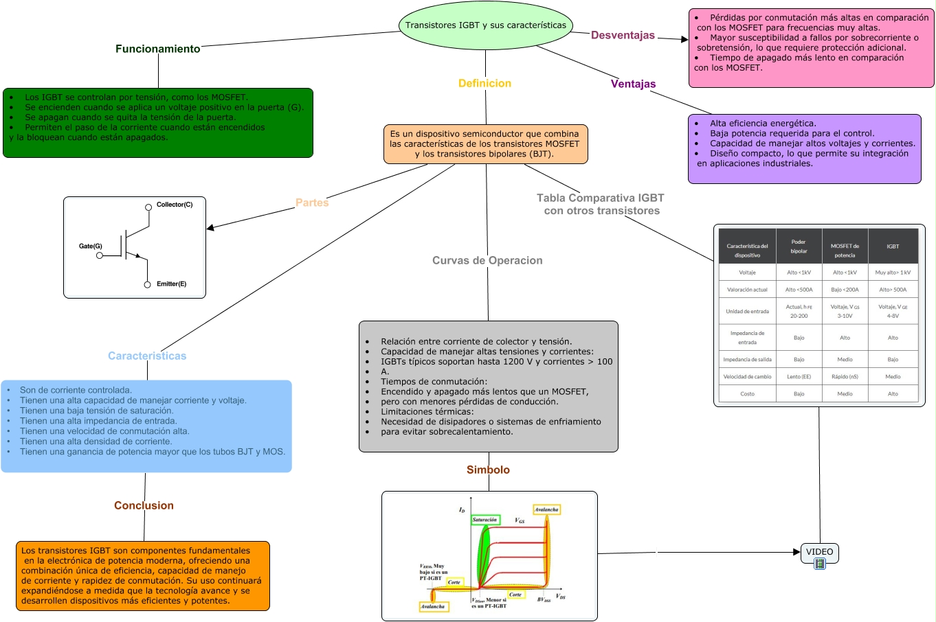 Este Cmap, tiene información relacionada con: Transistores IGBT y sus características 1, Transistores IGBT y sus características Funcionamiento • Los IGBT se controlan por tensión, como los MOSFET. • Se encienden cuando se aplica un voltaje positivo en la puerta (G). • Se apagan cuando se quita la tensión de la puerta. • Permiten el paso de la corriente cuando están encendidos y la bloquean cuando están apagados., ???? VIDEO, Es un dispositivo semiconductor que combina las características de los transistores MOSFET y los transistores bipolares (BJT). Partes, Es un dispositivo semiconductor que combina las características de los transistores MOSFET y los transistores bipolares (BJT). Caracteristicas • Son de corriente controlada. • Tienen una alta capacidad de manejar corriente y voltaje. • Tienen una baja tensión de saturación. • Tienen una alta impedancia de entrada. • Tienen una velocidad de conmutación alta. • Tienen una alta densidad de corriente. • Tienen una ganancia de potencia mayor que los tubos BJT y MOS., Transistores IGBT y sus características Ventajas • Alta eficiencia energética. • Baja potencia requerida para el control. • Capacidad de manejar altos voltajes y corrientes. • Diseño compacto, lo que permite su integración en aplicaciones industriales., • Son de corriente controlada. • Tienen una alta capacidad de manejar corriente y voltaje. • Tienen una baja tensión de saturación. • Tienen una alta impedancia de entrada. • Tienen una velocidad de conmutación alta. • Tienen una alta densidad de corriente. • Tienen una ganancia de potencia mayor que los tubos BJT y MOS. Conclusion Los transistores IGBT son componentes fundamentales en la electrónica de potencia moderna, ofreciendo una combinación única de eficiencia, capacidad de manejo de corriente y rapidez de conmutación. Su uso continuará expandiéndose a medida que la tecnología avance y se desarrollen dispositivos más eficientes y potentes., Transistores IGBT y sus características Desventajas • Pérdidas por conmutación más altas en comparación con los MOSFET para frecuencias muy altas. • Mayor susceptibilidad a fallos por sobrecorriente o sobretensión, lo que requiere protección adicional. • Tiempo de apagado más lento en comparación con los MOSFET., Es un dispositivo semiconductor que combina las características de los transistores MOSFET y los transistores bipolares (BJT). Caracteristicas • Son de corriente controlada. • Tienen una alta capacidad de manejar corriente y voltaje. • Tienen una baja tensión de saturación. • Tienen una alta impedancia de entrada. • Tienen una velocidad de conmutación alta. • Tienen una alta densidad de corriente. • Tienen una ganancia de potencia mayor que los tubos BJT y MOS., • Relación entre corriente de colector y tensión. • Capacidad de manejar altas tensiones y corrientes: • IGBTs típicos soportan hasta 1200 V y corrientes > 100 • A. • Tiempos de conmutación: • Encendido y apagado más lentos que un MOSFET, • pero con menores pérdidas de conducción. • Limitaciones térmicas: • Necesidad de disipadores o sistemas de enfriamiento • para evitar sobrecalentamiento. Simbolo, Es un dispositivo semiconductor que combina las características de los transistores MOSFET y los transistores bipolares (BJT). Tabla Comparativa IGBT con otros transistores, VIDEO, Transistores IGBT y sus características Definicion Es un dispositivo semiconductor que combina las características de los transistores MOSFET y los transistores bipolares (BJT)., Es un dispositivo semiconductor que combina las características de los transistores MOSFET y los transistores bipolares (BJT). Curvas de Operacion • Relación entre corriente de colector y tensión. • Capacidad de manejar altas tensiones y corrientes: • IGBTs típicos soportan hasta 1200 V y corrientes > 100 • A. • Tiempos de conmutación: • Encendido y apagado más lentos que un MOSFET, • pero con menores pérdidas de conducción. • Limitaciones térmicas: • Necesidad de disipadores o sistemas de enfriamiento • para evitar sobrecalentamiento.