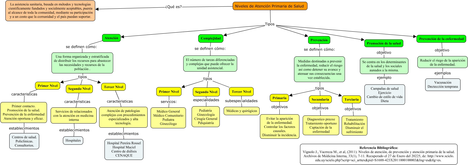 Este Cmap, tiene información relacionada con: Niveles de Atención, Secundaria objetivos Diagnostico precoz Tratamiento oportuno Captación de la enfermedad, Niveles de Atención Primaria de Salud ¿Qué es? La asistencia sanitaria, basada en métodos y tecnologías cientificamente fundados y socialmente aceptables, puesta al alcance de toda la comunidad, mediante su participación y a un costo que la comunidad y el país puedan soportar., Prevención de la enfermedad objetivo Reducir el riego de la aparición de la enfermedad., Atención se definen cómo: Una forma organizada y estratificada de distribuir los recursos para abastecer las necesidades y recursos de la población ., Primaria objetivos Evitar la aparición de la enfermedad. Controlar los factores causales. Disminuir la incidencia., Terciaria objetivos Tratamiento Rehabilitación Disminuir el sufrimiento, Niveles de Atención Primaria de Salud Tipos Prevención, Primer Nivel servicos: Médico General Médico Comunitario Pediatra Ginecólogo, Tercer Nivel subespecialidades Médicas y quirúgicas, Se centra en los determinantes de la salud y los sociales aunados a la misma. ejemplo Campañas de salud Ejercicio Cambio de estilo de vida Dieta, Una forma organizada y estratificada de distribuir los recursos para abastecer las necesidades y recursos de la población . tipos Tercer Nivel, El número de tareas diferenciadas y complejas que puede ofrecer la unidad asistencial. tipos Segundo Nivel, Complejidad se definen cómo: El número de tareas diferenciadas y complejas que puede ofrecer la unidad asistencial., Promoción de la salud objetivo Se centra en los determinantes de la salud y los sociales aunados a la misma., Niveles de Atención Primaria de Salud Tipos Complejidad, Tercer Nivel caracteristicas Atención de patologias complejas con procedimientos especializados y alta tecnología., Prevención se definen cómo: Medidas destinadas a prevenir la enfermedad, reducir el riesgo asi como detener su avance y atenuar sus consecuencias una vez establecida., Una forma organizada y estratificada de distribuir los recursos para abastecer las necesidades y recursos de la población . tipos Primer Nivel, Atención de patologias complejas con procedimientos especializados y alta tecnología. establecimientos Hospital Pereira Rossel Hospital Maciel Centro de diálisis CENAQUE, Medidas destinadas a prevenir la enfermedad, reducir el riesgo asi como detener su avance y atenuar sus consecuencias una vez establecida. tipos Terciaria