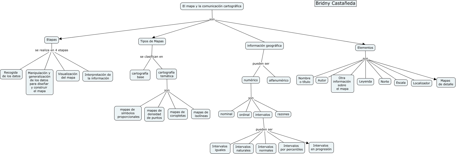 Este Cmap, tiene información relacionada con: Mapa Conceptual Bridny Castañeda, información geográfica pueden ser alfanumérico, Elementos son Localizador, Etapas se realiza en 4 etapas Recogida de los datos, El mapa y la comunicación cartográfica son Elementos, Etapas se realiza en 4 etapas Manipulación y generalización de los datos para diseñar y construir el mapa, numérico son intervalos, información geográfica pueden ser numérico, Elementos son Mapas de detalle, Elementos son Nombre o título, intervalos pueden ser Intervalos por percentiles, intervalos pueden ser Intervalos en progresión, El mapa y la comunicación cartográfica son información geográfica, El mapa y la comunicación cartográfica son Tipos de Mapas, Etapas se realiza en 4 etapas Interpretación de la información, numérico son ordinal, cartografía temática son mapas de coropletas, numérico son razones, El mapa y la comunicación cartográfica son Etapas, Elementos son Norte, Elementos son Leyenda