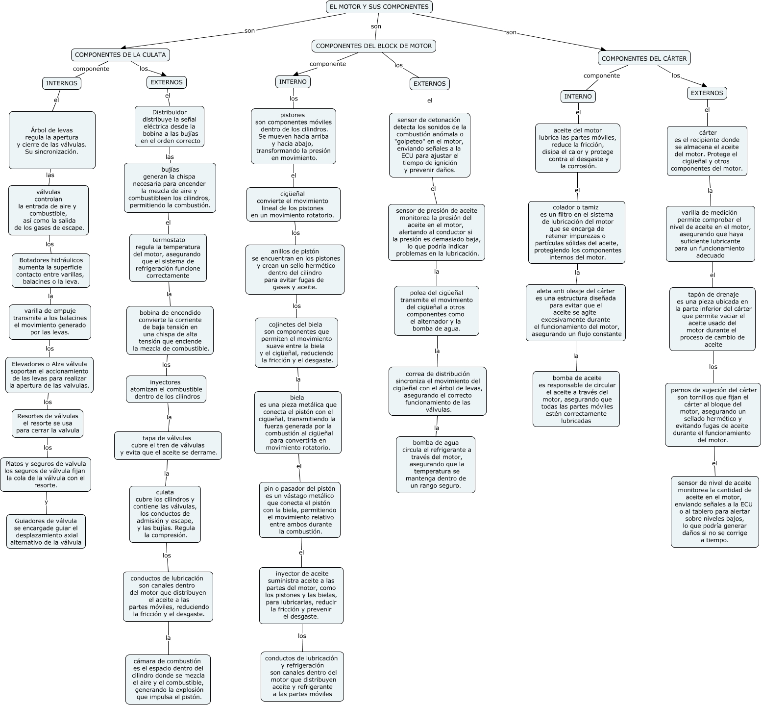 Este Cmap, tiene información relacionada con: motor y sus componentes 1, COMPONENTES DEL CÁRTER componente INTERNO, COMPONENTES DE LA CULATA los EXTERNOS, aceite del motor lubrica las partes móviles, reduce la fricción, disipa el calor y protege contra el desgaste y la corrosión. el colador o tamiz es un filtro en el sistema de lubricación del motor que se encarga de retener impurezas o partículas sólidas del aceite, protegiendo los componentes internos del motor., correa de distribución sincroniza el movimiento del cigüeñal con el árbol de levas, asegurando el correcto funcionamiento de las válvulas. la bomba de agua circula el refrigerante a través del motor, asegurando que la temperatura se mantenga dentro de un rango seguro., INTERNO el aceite del motor lubrica las partes móviles, reduce la fricción, disipa el calor y protege contra el desgaste y la corrosión., inyectores atomizan el combustible dentro de los cilindros la tapa de válvulas cubre el tren de válvulas y evita que el aceite se derrame., Platos y seguros de valvula los seguros de válvula fijan la cola de la válvula con el resorte. y Guiadores de válvula se encargade guiar el desplazamiento axial alternativo de la válvula, COMPONENTES DE LA CULATA componente INTERNOS, EXTERNOS el Distribuidor distribuye la señal eléctrica desde la bobina a las bujías en el orden correcto, biela es una pieza metálica que conecta el pistón con el cigüeñal, transmitiendo la fuerza generada por la combustión al cigüeñal para convertirla en movimiento rotatorio. el pin o pasador del pistón es un vástago metálico que conecta el pistón con la biela, permitiendo el movimiento relativo entre ambos durante la combustión., conductos de lubricación son canales dentro del motor que distribuyen el aceite a las partes móviles, reduciendo la fricción y el desgaste. la cámara de combustión es el espacio dentro del cilindro donde se mezcla el aire y el combustible, generando la explosión que impulsa el pistón., Árbol de levas regula la apertura y cierre de las válvulas. Su sincronización. las válvulas controlan la entrada de aire y combustible, así como la salida de los gases de escape., sensor de detonación detecta los sonidos de la combustión anómala o "golpeteo" en el motor, enviando señales a la ECU para ajustar el tiempo de ignición y prevenir daños. el sensor de presión de aceite monitorea la presión del aceite en el motor, alertando al conductor si la presión es demasiado baja, lo que podría indicar problemas en la lubricación., polea del cigüeñal transmite el movimiento del cigüeñal a otros componentes como el alternador y la bomba de agua. la correa de distribución sincroniza el movimiento del cigüeñal con el árbol de levas, asegurando el correcto funcionamiento de las válvulas., sensor de presión de aceite monitorea la presión del aceite en el motor, alertando al conductor si la presión es demasiado baja, lo que podría indicar problemas en la lubricación. la polea del cigüeñal transmite el movimiento del cigüeñal a otros componentes como el alternador y la bomba de agua., culata cubre los cilindros y contiene las válvulas, los conductos de admisión y escape, y las bujías. Regula la compresión. los conductos de lubricación son canales dentro del motor que distribuyen el aceite a las partes móviles, reduciendo la fricción y el desgaste., anillos de pistón se encuentran en los pistones y crean un sello hermético dentro del cilindro para evitar fugas de gases y aceite. los cojinetes del biela son componentes que permiten el movimiento suave entre la biela y el cigüeñal, reduciendo la fricción y el desgaste., aleta anti oleaje del cárter es una estructura diseñada para evitar que el aceite se agite excesivamente durante el funcionamiento del motor, asegurando un flujo constante la bomba de aceite es responsable de circular el aceite a través del motor, asegurando que todas las partes móviles estén correctamente lubricadas, varilla de medición permite comprobar el nivel de aceite en el motor, asegurando que haya suficiente lubricante para un funcionamiento adecuado el tapón de drenaje es una pieza ubicada en la parte inferior del cárter que permite vaciar el aceite usado del motor durante el proceso de cambio de aceite, EL MOTOR Y SUS COMPONENTES son COMPONENTES DE LA CULATA