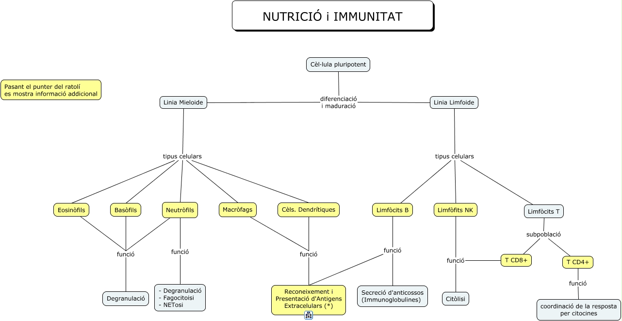 Este Cmap, tiene información relacionada con: Hematopoièsi, Limfòfits NK funció Citòlisi, Linia Limfoide diferenciació i maduració Linia Mieloide, Neutròfils funció Degranulació, Linia Mieloide tipus celulars Eosinòfils, Linia Limfoide tipus celulars Limfòfits NK, Linia Mieloide tipus celulars Basòfils, Neutròfils funció - Degranulació - Fagocitoisi - NETosi, T CD8+ funció Citòlisi, Basòfils funció Degranulació, Cèl·lula pluripotent diferenciació i maduració Linia Mieloide, Linia Limfoide tipus celulars Limfòcits T, Limfòcits T subpoblació T CD4+, Linia Limfoide tipus celulars Limfòcits B, Limfòcits B funció Secreció d'anticossos (Immunoglobulines), Cèls. Dendrítiques funció Reconeixement i Presentació d'Antigens Extracelulars (*), Linia Mieloide tipus celulars Macròfags, Linia Mieloide tipus celulars Cèls. Dendrítiques, Linia Mieloide tipus celulars Neutròfils, Eosinòfils funció Degranulació, T CD4+ funció coordinació de la resposta per citocines