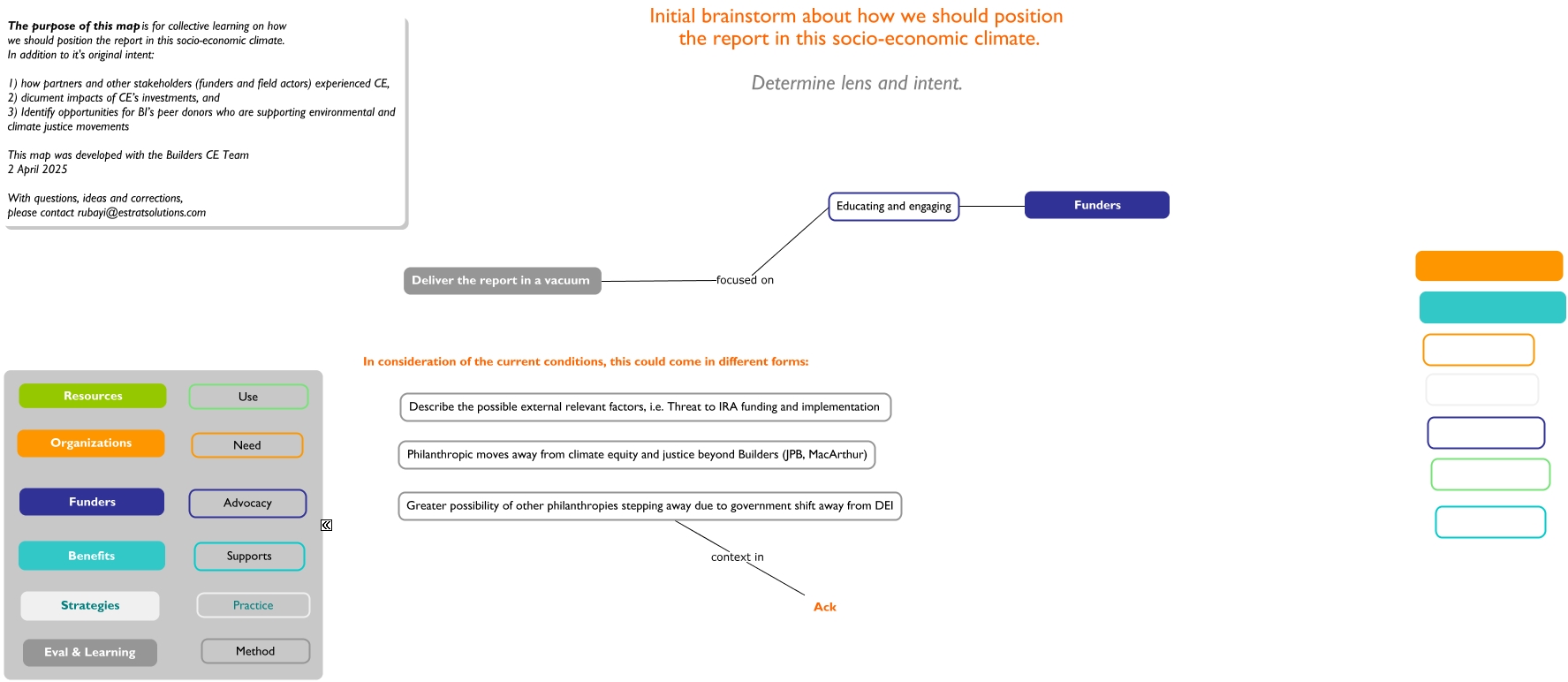 This Concept Map, created with IHMC CmapTools, has information related to: 4.2.25 BI CE Report Content, Deliver the report in a vacuum focused on Educating and engaging, Greater possibility of other philanthropies stepping away due to government shift away from DEI context in Ack, Educating and engaging Funders