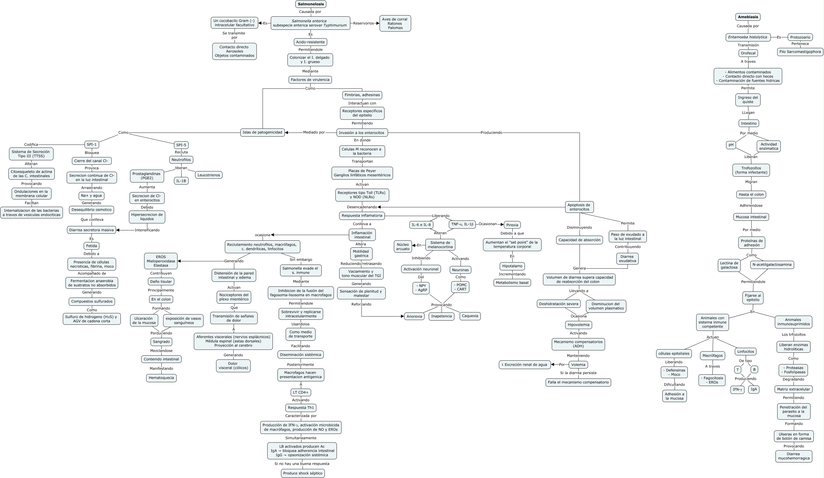 Este Cmap, tiene información relacionada con: Medicina Interna Corte2, Volumen de diarrea supera capacidad de reabsorción del colon Llevando a Deshidratación severa, Animales con sistema inmune competente Actuan Macrófagos, B Produciendo IgA, Respuesta Th1 Caracterizada por Producción de IFN-γ, activación microbicida de macrófagos, producción de NO y EROs, Inflamación intestinal ocasiona Reclutamiento neutrofilos, macrófagos, c. dendríticas, linfocitos, Fijarse al epitelio En Animales inmunosuprimidos, - Defensinas - Moco Dificultando Adhesión a la mucosa, Animales con sistema inmune competente Actuan Linfocitos, Amebiasis Causada por Entamoeba histolytica, Hipotalamo Incrementando Metabolismo basal, Apoptosis de enterocitos Permite Paso de exudado a la luz intestinal, - NPY - AgRP Provocando Caquexia, Respuesta inflamatoria Conlleva a Inflamación intestinal, LB activados producen Ac IgA → bloquea adherencia intestinal IgG → opsonización sistémica Si no hay una buena respuesta Produce shock séptico, Ondulaciones en la membrana celular Faciltan Internalizacion de las bacterias a traves de vesiculas endociticas, Ingreso del quiste LLegan Intestino, Inhibicion de la fusión del fagosoma-lisosoma en macrofagos Permitiendole Sobrevivir y replicarse intracelularmente, Sensación de plenitud y malestar Reforzando Anorexia, SPI-1 Codifica Sistema de Secreción Tipo III (TTSS), Linfocitos De tipo T