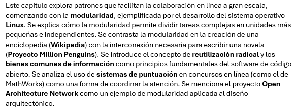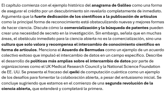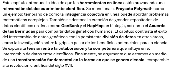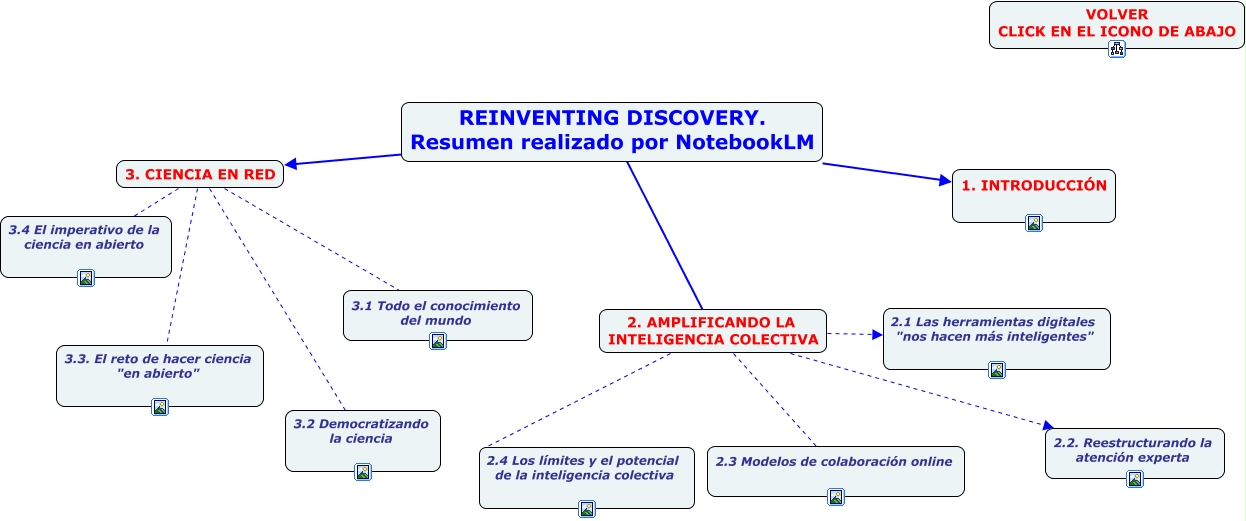 Este Cmap, tiene información relacionada con: Resumen NotebookLM, REINVENTING DISCOVERY. Resumen realizado por NotebookLM 2. AMPLIFICANDO LA INTELIGENCIA COLECTIVA, 3. CIENCIA EN RED 3.4 El imperativo de la ciencia en abierto, REINVENTING DISCOVERY. Resumen realizado por NotebookLM 3. CIENCIA EN RED, REINVENTING DISCOVERY. Resumen realizado por NotebookLM 1. INTRODUCCIÓN, 2. AMPLIFICANDO LA INTELIGENCIA COLECTIVA 2.4 Los límites y el potencial de la inteligencia colectiva, 3. CIENCIA EN RED 3.1 Todo el conocimiento del mundo, 2. AMPLIFICANDO LA INTELIGENCIA COLECTIVA 2.3 Modelos de colaboración online, 2. AMPLIFICANDO LA INTELIGENCIA COLECTIVA 2.1 Las herramientas digitales "nos hacen más inteligentes", 3. CIENCIA EN RED 3.3. El reto de hacer ciencia "en abierto", 2. AMPLIFICANDO LA INTELIGENCIA COLECTIVA 2.2. Reestructurando la atención experta, 3. CIENCIA EN RED 3.2 Democratizando la ciencia