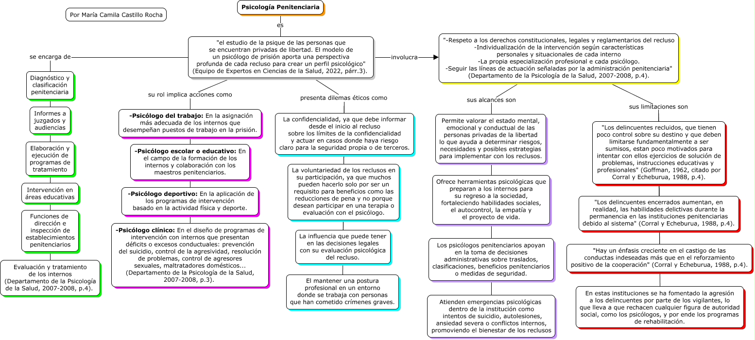 Este Cmap, tiene información relacionada con: Psicología Penitenciaria, "el estudio de la psique de las personas que se encuentran privadas de libertad. El modelo de un psicólogo de prisión aporta una perspectiva profunda de cada recluso para crear un perfil psicológico" (Equipo de Expertos en Ciencias de la Salud, 2022, párr.3). se encarga de Elaboración y ejecución de programas de tratamiento, "el estudio de la psique de las personas que se encuentran privadas de libertad. El modelo de un psicólogo de prisión aporta una perspectiva profunda de cada recluso para crear un perfil psicológico" (Equipo de Expertos en Ciencias de la Salud, 2022, párr.3). se encarga de Intervención en áreas educativas, "el estudio de la psique de las personas que se encuentran privadas de libertad. El modelo de un psicólogo de prisión aporta una perspectiva profunda de cada recluso para crear un perfil psicológico" (Equipo de Expertos en Ciencias de la Salud, 2022, párr.3). su rol implica acciones como -Psicólogo clínico: En el diseño de programas de intervención con internos que presentan déficits o excesos conductuales: prevención del suicidio, control de la agresividad, resolución de problemas, control de agresores sexuales, maltratadores domésticos... (Departamento de la Psicología de la Salud, 2007-2008, p.3)., "el estudio de la psique de las personas que se encuentran privadas de libertad. El modelo de un psicólogo de prisión aporta una perspectiva profunda de cada recluso para crear un perfil psicológico" (Equipo de Expertos en Ciencias de la Salud, 2022, párr.3). se encarga de Diagnóstico y clasificación penitenciaria, "-Respeto a los derechos constitucionales, legales y reglamentarios del recluso -Individualización de la intervención según características personales y situacionales de cada interno -La propia especialización profesional e cada psicólogo. -Seguir las líneas de actuación señaladas por la administración penitenciaria" (Departamento de la Psicología de la Salud, 2007-2008, p.4). sus alcances son Atienden emergencias psicológicas dentro de la institución como intentos de suicidio, autolesiones, ansiedad severa o conflictos internos, promoviendo el bienestar de los reclusos, "-Respeto a los derechos constitucionales, legales y reglamentarios del recluso -Individualización de la intervención según características personales y situacionales de cada interno -La propia especialización profesional e cada psicólogo. -Seguir las líneas de actuación señaladas por la administración penitenciaria" (Departamento de la Psicología de la Salud, 2007-2008, p.4). sus limitaciones son "Hay un énfasis creciente en el castigo de las conductas indeseadas más que en el reforzamiento positivo de la cooperación" (Corral y Echeburua, 1988, p.4)., "el estudio de la psique de las personas que se encuentran privadas de libertad. El modelo de un psicólogo de prisión aporta una perspectiva profunda de cada recluso para crear un perfil psicológico" (Equipo de Expertos en Ciencias de la Salud, 2022, párr.3). se encarga de Informes a juzgados y audiencias, "Los delincuentes encerrados aumentan, en realidad, las habilidades delictivas durante la permanencia en las instituciones penitenciarias debido al sistema" (Corral y Echeburua, 1988, p.4). sus limitaciones son "Los delincuentes recluidos, que tienen poco control sobre su destino y que deben limitarse fundamentalmente a ser sumisos, estan poco motivados para intentar con ellos ejercicios de solución de problemas, instrucciones educativas y profesionales" (Goffman, 1962, citado por Corral y Echeburua, 1988, p.4)., "-Respeto a los derechos constitucionales, legales y reglamentarios del recluso -Individualización de la intervención según características personales y situacionales de cada interno -La propia especialización profesional e cada psicólogo. -Seguir las líneas de actuación señaladas por la administración penitenciaria" (Departamento de la Psicología de la Salud, 2007-2008, p.4). sus alcances son Permite valorar el estado mental, emocional y conductual de las personas privadas de la libertad lo que ayuda a determinar riesgos, necesidades y posibles estrategias para implementar con los reclusos., "el estudio de la psique de las personas que se encuentran privadas de libertad. El modelo de un psicólogo de prisión aporta una perspectiva profunda de cada recluso para crear un perfil psicológico" (Equipo de Expertos en Ciencias de la Salud, 2022, párr.3). involucra "-Respeto a los derechos constitucionales, legales y reglamentarios del recluso -Individualización de la intervención según características personales y situacionales de cada interno -La propia especialización profesional e cada psicólogo. -Seguir las líneas de actuación señaladas por la administración penitenciaria" (Departamento de la Psicología de la Salud, 2007-2008, p.4)., "el estudio de la psique de las personas que se encuentran privadas de libertad. El modelo de un psicólogo de prisión aporta una perspectiva profunda de cada recluso para crear un perfil psicológico" (Equipo de Expertos en Ciencias de la Salud, 2022, párr.3). presenta dilemas éticos como La influencia que puede tener en las decisiones legales con su evaluación psicológica del recluso., "-Respeto a los derechos constitucionales, legales y reglamentarios del recluso -Individualización de la intervención según características personales y situacionales de cada interno -La propia especialización profesional e cada psicólogo. -Seguir las líneas de actuación señaladas por la administración penitenciaria" (Departamento de la Psicología de la Salud, 2007-2008, p.4). sus limitaciones son "Los delincuentes recluidos, que tienen poco control sobre su destino y que deben limitarse fundamentalmente a ser sumisos, estan poco motivados para intentar con ellos ejercicios de solución de problemas, instrucciones educativas y profesionales" (Gof