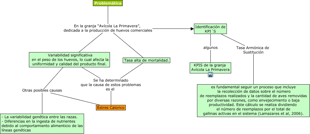 Este Cmap, tiene información relacionada con: Problemática, Problemática En la granja “Avícola La Primavera”, dedicada a la producción de huevos comerciales Identificación de KPI´S, Estres Calorico Otras posibles causas - La variabilidad genética entre las razas. - Diferencias en la ingesta de nutrientes debido al comportamiento alimenticio de las líneas genéticas, Problemática En la granja “Avícola La Primavera”, dedicada a la producción de huevos comerciales Tasa alta de mortalidad., Identificación de KPI´S Tasa Armónica de Sustitución es fundamental seguir un proceso que incluye la recolección de datos sobre el número de reemplazos realizados y la cantidad de aves removidas por diversas razones, como envejecimiento o baja productividad. Este cálculo se realiza dividiendo el número de reemplazos por el total de gallinas activas en el sistema (Lamazares et al, 2006)., Variabilidad significativa en el peso de los huevos, lo cual afecta la uniformidad y calidad del producto final. Otras posibles causas - La variabilidad genética entre las razas. - Diferencias en la ingesta de nutrientes debido al comportamiento alimenticio de las líneas genéticas, Tasa alta de mortalidad. Se ha determinado que la causa de estos problemas es el Estres Calorico, Problemática En la granja “Avícola La Primavera”, dedicada a la producción de huevos comerciales Variabilidad significativa en el peso de los huevos, lo cual afecta la uniformidad y calidad del producto final., Variabilidad significativa en el peso de los huevos, lo cual afecta la uniformidad y calidad del producto final. Se ha determinado que la causa de estos problemas es el Estres Calorico, Identificación de KPI´S algunos KPIS de la granja Avícola La Primavera