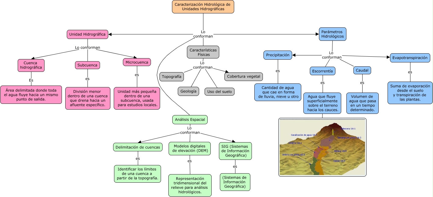 Este Cmap, tiene información relacionada con: HS3, Caracterización Hidrológica de Unidades Hidrográficas Lo conforman Características Físicas, Características Físicas Lo conforman Uso del suelo, SIG (Sistemas de Información Geográfica) es (Sistemas de Información Geográfica), Unidad Hidrográfica Lo conforman Microcuenca, Caracterización Hidrológica de Unidades Hidrográficas Lo conforman Parámetros Hidrológicos, Subcuenca es División menor dentro de una cuenca que drena hacia un afluente específico., Parámetros Hidrológicos Lo conforman Precipitación, Evapotranspiración es Suma de evaporación desde el suelo y transpiración de las plantas., Cuenca hidrográfica Es Área delimitada donde toda el agua fluye hacia un mismo punto de salida., Agua que fluye superficialmente sobre el terreno hacia los cauces., Caudal es Volumen de agua que pasa en un tiempo determinado., Caracterización Hidrológica de Unidades Hidrográficas Lo conforman Análisis Espacial, Características Físicas Lo conforman Geología, Caracterización Hidrológica de Unidades Hidrográficas Lo conforman Unidad Hidrográfica, Características Físicas Lo conforman Cobertura vegetal, Características Físicas Lo conforman Topografía, Unidad Hidrográfica Lo conforman Subcuenca, Precipitación es Cantidad de agua que cae en forma de lluvia, nieve u otro, Unidad Hidrográfica Lo conforman Cuenca hidrográfica, Parámetros Hidrológicos Lo conforman Evapotranspiración