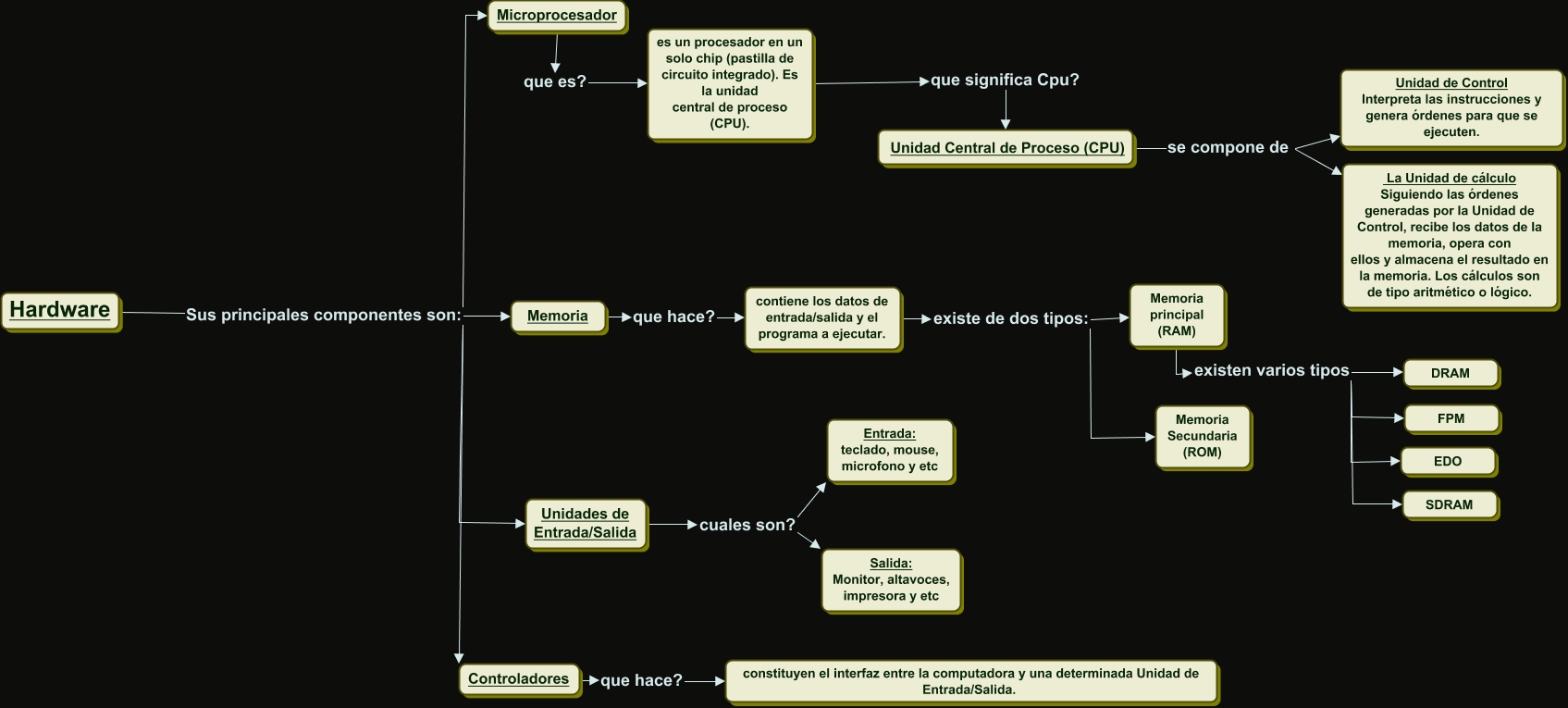 Este Cmap, tiene información relacionada con: Sin Título 2, Hardware Sus principales componentes son: Microprocesador, Hardware Sus principales componentes son: Unidades de Entrada/Salida, Memoria que hace? contiene los datos de entrada/salida y el programa a ejecutar., Unidad Central de Proceso (CPU) se compone de La Unidad de cálculo Siguiendo las órdenes generadas por la Unidad de Control, recibe los datos de la memoria, opera con ellos y almacena el resultado en la memoria. Los cálculos son de tipo aritmético o lógico., Memoria principall(RAM) existen varios tipos DRAM, Unidades de Entrada/Salida cuales son? Salida: Monitor, altavoces, impresora y etc, contiene los datos de entrada/salida y el programa a ejecutar. existe de dos tipos: Memoria principall(RAM), Memoria principall(RAM) existen varios tipos SDRAM, Microprocesador que es? es un procesador en un solo chip (pastilla de circuito integrado). Es la unidad central de proceso (CPU)., Unidades de Entrada/Salida cuales son? Entrada: teclado, mouse, microfono y etc, Hardware Sus principales componentes son: Controladores, Unidad Central de Proceso (CPU) se compone de Unidad de Control Interpreta las instrucciones y genera órdenes para que se ejecuten., Controladores que hace? constituyen el interfaz entre la computadora y una determinada Unidad de Entrada/Salida., contiene los datos de entrada/salida y el programa a ejecutar. existe de dos tipos: Memoria Secundaria (ROM), es un procesador en un solo chip (pastilla de circuito integrado). Es la unidad central de proceso (CPU). que significa Cpu? Unidad Central de Proceso (CPU), Memoria principall(RAM) existen varios tipos FPM, Hardware Sus principales componentes son: Memoria, Memoria principall(RAM) existen varios tipos EDO