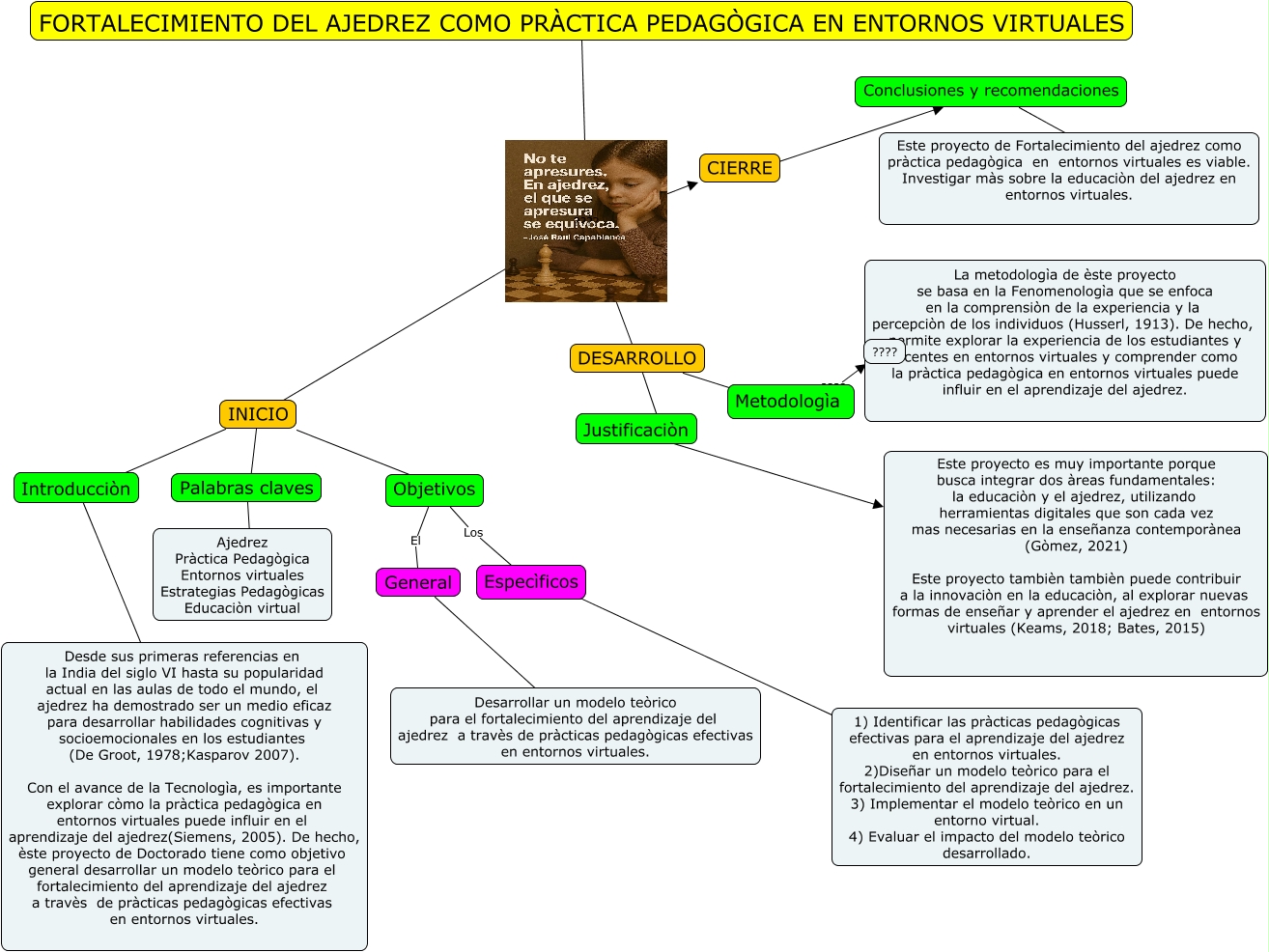 Este Cmap, tiene información relacionada con: FORTALECIMIENTO DEL AJEDREZ COMO PRÀCTICA PEDAGÒGICA EN ENTORNOS VIRTUALES-DAGNOY EMILIO BLANDÒN MENA, General ???? Desarrollar un modelo teòrico para el fortalecimiento del aprendizaje del ajedrez a travès de pràcticas pedagògicas efectivas en entornos virtuales., Objetivos El General, CIERRE ???? Conclusiones y recomendaciones, DESARROLLO ???? Metodologìa, INICIO ???? Palabras claves, Especìficos ???? 1) Identificar las pràcticas pedagògicas efectivas para el aprendizaje del ajedrez en entornos virtuales. 2)Diseñar un modelo teòrico para el fortalecimiento del aprendizaje del ajedrez. 3) Implementar el modelo teòrico en un entorno virtual. 4) Evaluar el impacto del modelo teòrico desarrollado., Conclusiones y recomendaciones ???? ????, FORTALECIMIENTO DEL AJEDREZ COMO PRÀCTICA PEDAGÒGICA EN ENTORNOS VIRTUALES ???? INICIO, INICIO ???? Objetivos, Palabras claves ???? Ajedrez Pràctica Pedagògica Entornos virtuales Estrategias Pedagògicas Educaciòn virtual, DESARROLLO ???? Justificaciòn, FORTALECIMIENTO DEL AJEDREZ COMO PRÀCTICA PEDAGÒGICA EN ENTORNOS VIRTUALES ???? CIERRE, Introducciòn ???? Desde sus primeras referencias en la India del siglo VI hasta su popularidad actual en las aulas de todo el mundo, el ajedrez ha demostrado ser un medio eficaz para desarrollar habilidades cognitivas y socioemocionales en los estudiantes (De Groot, 1978;Kasparov 2007). Con el avance de la Tecnologìa, es importante explorar còmo la pràctica pedagògica en entornos virtuales puede influir en el aprendizaje del ajedrez(Siemens, 2005). De hecho, èste proyecto de Doctorado tiene como objetivo general desarrollar un modelo teòrico para el fortalecimiento del aprendizaje del ajedrez a travès de pràcticas pedagògicas efectivas en entornos virtuales., INICIO ???? Introducciòn, Justificaciòn ???? Este proyecto es muy importante porque busca integrar dos àreas fundamentales: la educaciòn y el ajedrez, utilizando herramientas digitales que son cada vez mas necesarias en la enseñanza contemporànea (Gòmez, 2021) Este proyecto tambièn tambièn puede contribuir a la innovaciòn en la educaciòn, al explorar nuevas formas de enseñar y aprender el ajedrez en entornos virtuales (Keams, 2018; Bates, 2015), FORTALECIMIENTO DEL AJEDREZ COMO PRÀCTICA PEDAGÒGICA EN ENTORNOS VIRTUALES ???? DESARROLLO, Metodologìa ???? ????, Objetivos Los Especìficos
