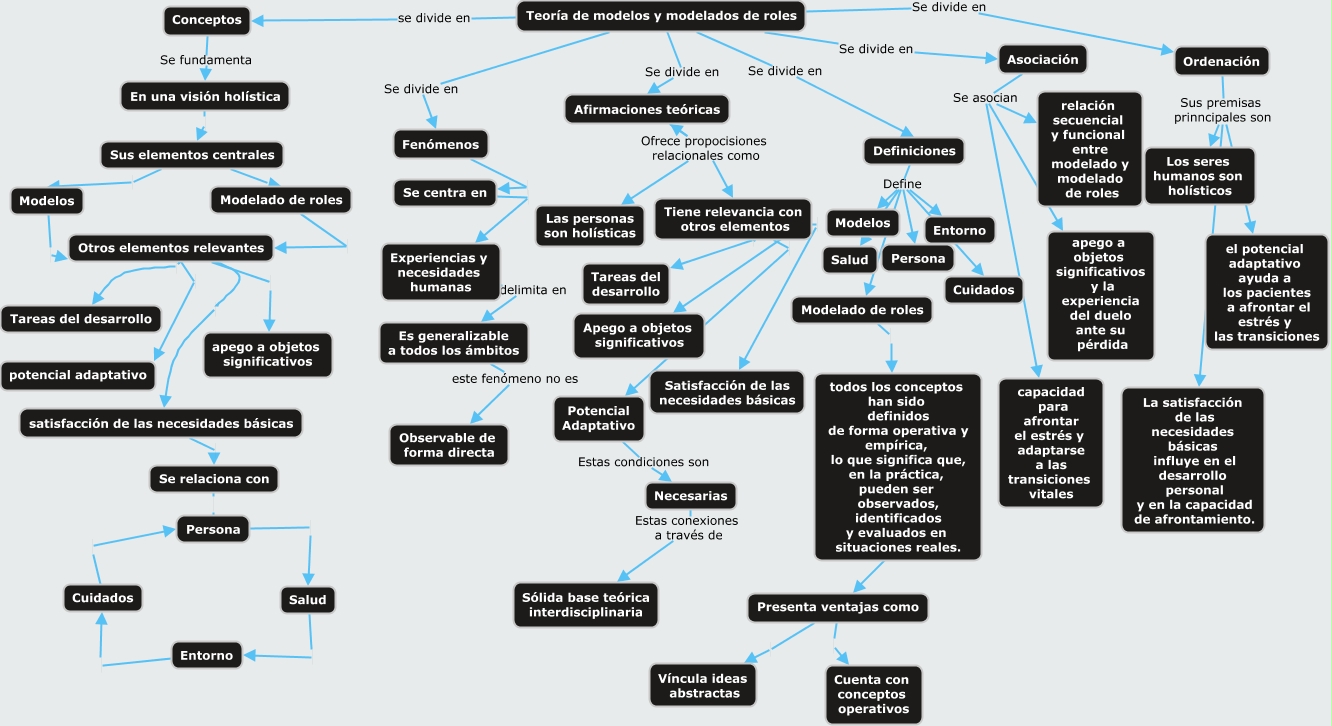Este Cmap, tiene información relacionada con: Mapa teoría de modelos y modelados, Afirmaciones teóricas Ofrece propocisiones relacionales como Las personas son holísticas, Definiciones Define Persona, Presenta ventajas como Víncula ideas abstractas, En una visión holística Sus elementos centrales, Asociación Se asocian apego a objetos significativos y la experiencia del duelo ante su pérdida, Teoría de modelos y modelados de roles Se divide en Afirmaciones teóricas, Experiencias y necesidades humanas Se delimita en Es generalizable a todos los ámbitos, Presenta ventajas como Cuenta con conceptos operativos, Se relaciona con Persona, Modelado de roles todos los conceptos han sido definidos de forma operativa y empírica, lo que significa que, en la práctica, pueden ser observados, identificados y evaluados en situaciones reales., Otros elementos relevantes apego a objetos significativos, Teoría de modelos y modelados de roles Se divide en Ordenación, Entorno Cuidados, Modelos Otros elementos relevantes, Afirmaciones teóricas Ofrece propocisiones relacionales como Tiene relevancia con otros elementos, Ordenación Sus premisas prinncipales son La satisfacción de las necesidades básicas influye en el desarrollo personal y en la capacidad de afrontamiento., Potencial Adaptativo Estas condiciones son Necesarias, Es generalizable a todos los ámbitos este fenómeno no es Observable de forma directa, Salud Entorno, Otros elementos relevantes satisfacción de las necesidades básicas