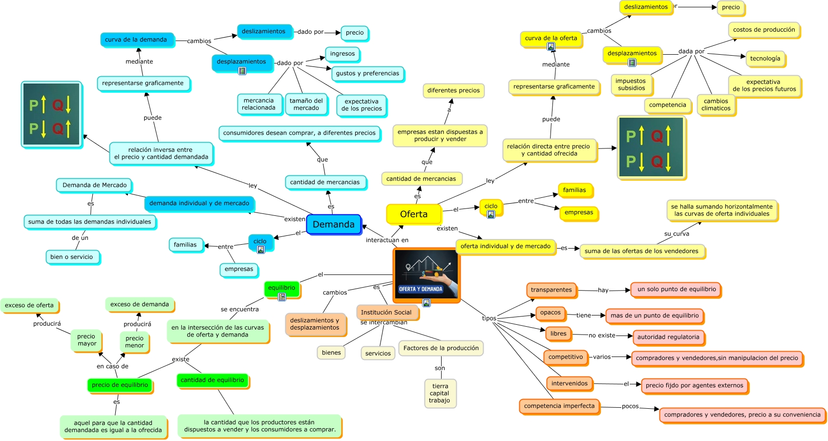 Este Cmap, tiene información relacionada con: DEMANDA,OFERTA Y MERCADO.cmap, Oferta es cantidad de mercancias, desplazamientos dado por mercancia relacionada, Factores de la producción se intercambian servicios, desplazamientos dada por expectativa de los precios futuros, empresas estan dispuestas a producir y vender a diferentes precios, suma de las ofertas de los vendedores su curva se halla sumando horizontalmente las curvas de oferta individuales, equilibrio se encuentra en la intersección de las curvas de oferta y demanda, ciclo entre familias, deslizamientos dado por precio, demanda individual y de mercado ???? Demanda de Mercado, Demanda es cantidad de mercancias, relación directa entre precio y cantidad ofrecida ????, en la intersección de las curvas de oferta y demanda existe precio de equilibrio, Factores de la producción son tierra capital trabajo, interactuan en Oferta, Oferta ley relación directa entre precio y cantidad ofrecida, opacos tiene mas de un punto de equilibrio, Institución Social se intercambian bienes, relación inversa entre el precio y cantidad demandada puede representarse graficamente, ciclo entre empresas