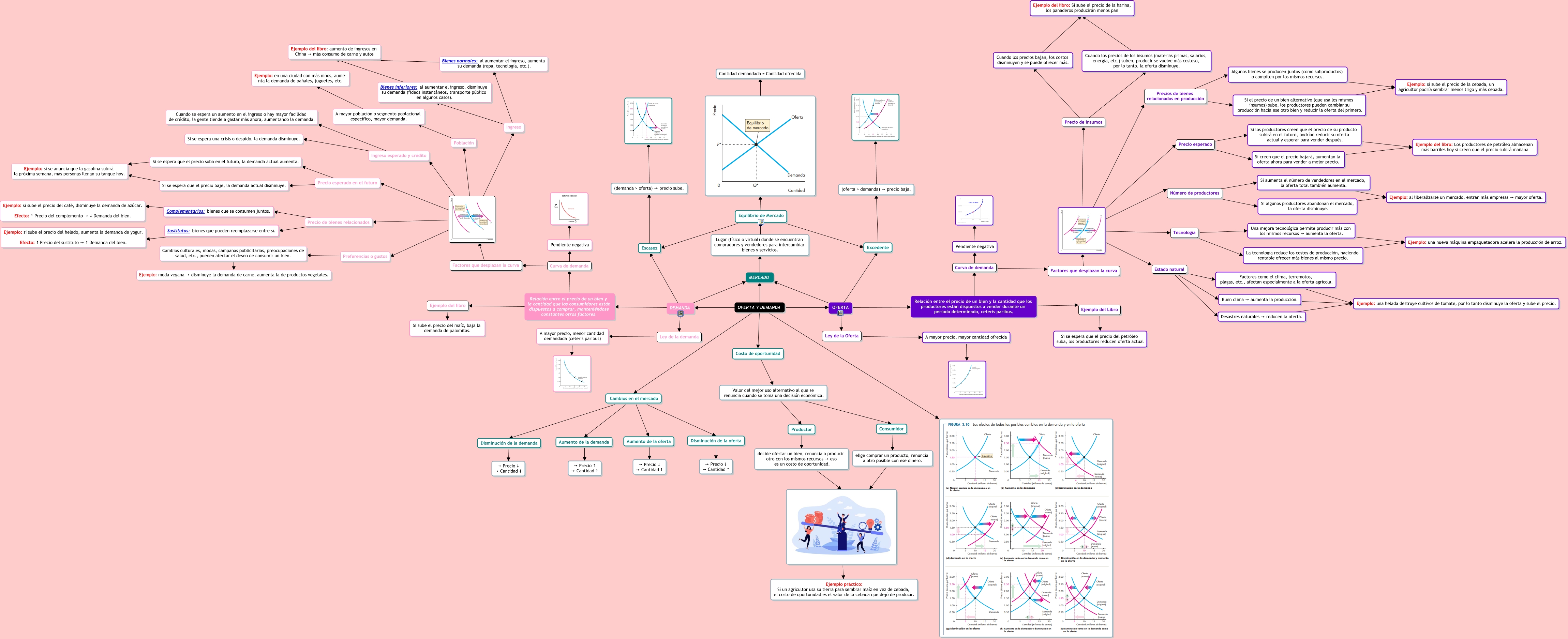 Este Cmap, tiene información relacionada con: OFERTA Y DEMANDA, elige comprar un producto, renuncia a otro posible con ese dinero. ????, Factores como el clima, terremotos, plagas, etc., afectan especialmente a la oferta agrícola. Ejemplo: una helada destruye cultivos de tomate, por lo tanto disminuye la oferta y sube el precio., Estado natural Desastres naturales → reducen la oferta., Escasez (demanda > oferta) → precio sube., OFERTA Y DEMANDA Cambios en el mercado, Si se espera que el precio baje, la demanda actual disminuye. Ejemplo: si se anuncia que la gasolina subirá la próxima semana, más personas llenan su tanque hoy., Si algunos productores abandonan el mercado, la oferta disminuye. Ejemplo: al liberalizarse un mercado, entran más empresas → mayor oferta., Tecnología, Relación entre el precio de un bien y la cantidad que los consumidores están dispuestos a comprar, manteniéndose constantes otros factores. Curva de demanda, Número de productores, DEMANDA MERCADO, Cuando los precios de los insumos (materias primas, salarios, energía, etc.) suben, producir se vuelve más costoso, por lo tanto, la oferta disminuye. Ejemplo del libro: Si sube el precio de la harina, los panaderos producirán menos pan, Precio esperado Si creen que el precio bajará, aumentan la oferta ahora para vender a mejor precio., Cambios en el mercado Aumento de la demanda, Cambios en el mercado Aumento de la oferta, Estado natural Buen clima → aumenta la producción., Factores que desplazan la curva, Precios de bienes relacionados en producción Algunos bienes se producen juntos (como subproductos) o compiten por los mismos recursos., Cantidad demandada = Cantidad ofrecida, Si se espera que el precio suba en el futuro, la demanda actual aumenta. Ejemplo: si se anuncia que la gasolina subirá la próxima semana, más personas llenan su tanque hoy.