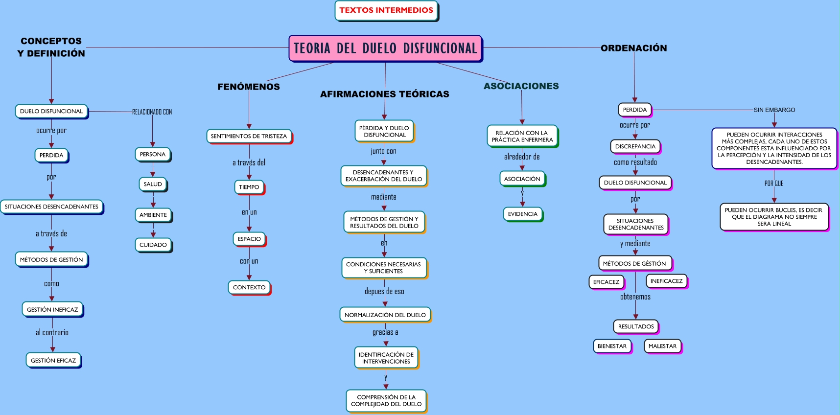 Este Cmap, tiene información relacionada con: textos intermedio, DUELO DISFUNCIONAL RELACIONADO CON PERSONA, SALUD . AMBIENTE, TEORIA DEL DUELO DISFUNCIONAL ASOCIACIONES RELACIÓN CON LA PRÁCTICA ENFERMERA, SITUACIONES DESENCADENANTES y mediante MÉTODOS DE GÉSTIÓN, GESTIÓN INEFICAZ al contrario GESTIÓN EFICAZ, ESPACIO con un CONTEXTO, SENTIMIENTOS DE TRISTEZA a través del TIEMPO, TEORIA DEL DUELO DISFUNCIONAL CONCEPTOS Y DEFINICIÓN DUELO DISFUNCIONAL, MÉTODOS DE GESTIÓN Y RESULTADOS DEL DUELO en CONDICIONES NECESARIAS Y SUFICIENTES, TEORIA DEL DUELO DISFUNCIONAL AFIRMACIONES TEÓRICAS PÉRDIDA Y DUELO DISFUNCIONAL, DUELO DISFUNCIONAL por SITUACIONES DESENCADENANTES, PERDIDA ocurre por DISCREPANCIA, TEORIA DEL DUELO DISFUNCIONAL FENÓMENOS SENTIMIENTOS DE TRISTEZA, PUEDEN OCURRIR INTERACCIONES MÁS COMPLEJAS, CADA UNO DE ESTOS COMPONENTES ESTA INFLUENCIADO POR LA PERCEPCIÓN Y LA INTENSIDAD DE LOS DESENCADENANTES. POR QUE PUEDEN OCURRIR BUCLES, ES DECIR QUE EL DIAGRAMA NO SIEMPRE SERA LINEAL, DUELO DISFUNCIONAL ocurre por PERDIDA, DESENCADENANTES Y EXACERBACIÓN DEL DUELO mediante MÉTODOS DE GESTIÓN Y RESULTADOS DEL DUELO, ASOCIACIÓN y EVIDENCIA, AMBIENTE . CUIDADO, TEORIA DEL DUELO DISFUNCIONAL ORDENACIÓN PERDIDA, RELACIÓN CON LA PRÁCTICA ENFERMERA alrededor de ASOCIACIÓN