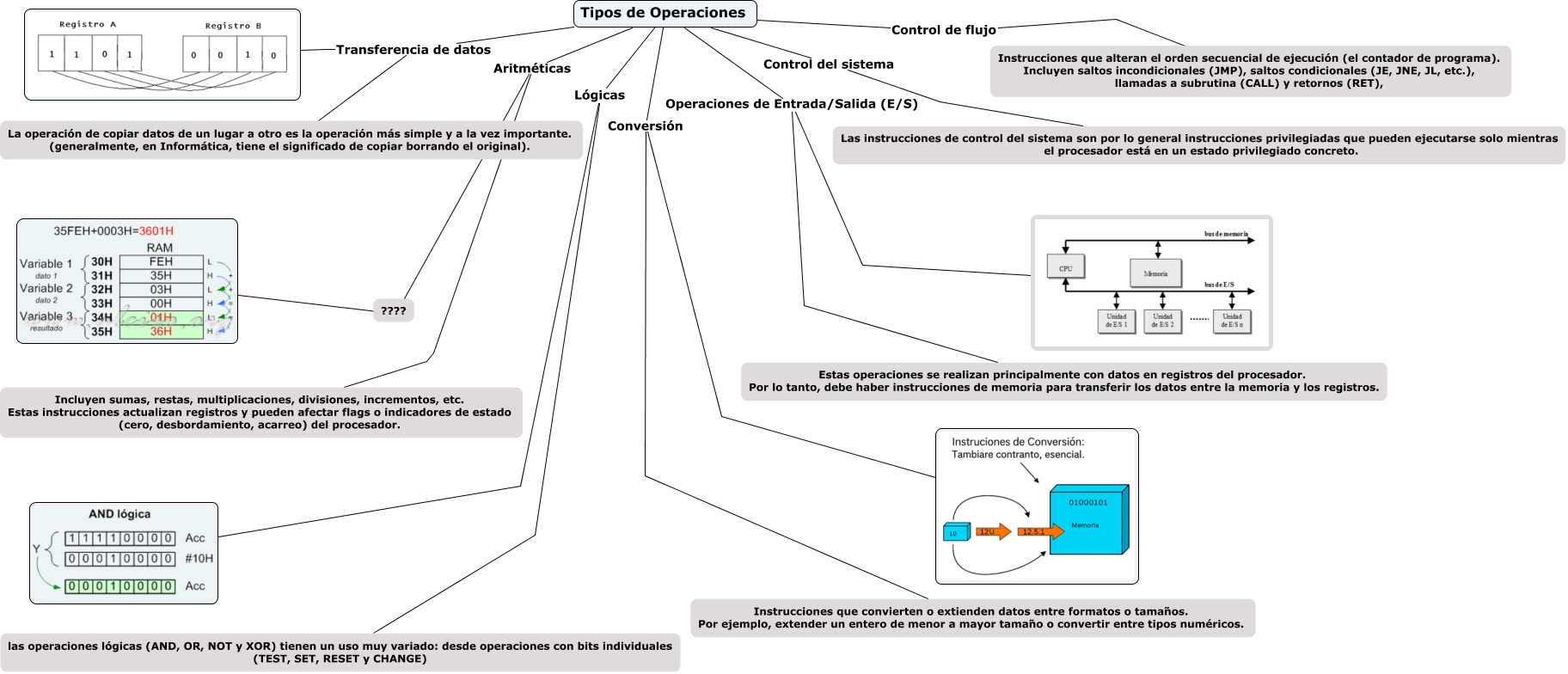 Este Cmap, tiene información relacionada con: Bloque 3, Tipos de Operaciones Lógicas las operaciones lógicas (AND, OR, NOT y XOR) tienen un uso muy variado: desde operaciones con bits individuales (TEST, SET, RESET y CHANGE), Transferencia de datos La operación de copiar datos de un lugar a otro es la operación más simple y a la vez importante. (generalmente, en Informática, tiene el significado de copiar borrando el original)., Tipos de Operaciones Transferencia de datos La operación de copiar datos de un lugar a otro es la operación más simple y a la vez importante. (generalmente, en Informática, tiene el significado de copiar borrando el original)., Tipos de Operaciones Control de flujo Instrucciones que alteran el orden secuencial de ejecución (el contador de programa). Incluyen saltos incondicionales (JMP), saltos condicionales (JE, JNE, JL, etc.), llamadas a subrutina (CALL) y retornos (RET),, Conversión Instrucciones que convierten o extienden datos entre formatos o tamaños. Por ejemplo, extender un entero de menor a mayor tamaño o convertir entre tipos numéricos., Lógicas las operaciones lógicas (AND, OR, NOT y XOR) tienen un uso muy variado: desde operaciones con bits individuales (TEST, SET, RESET y CHANGE), Tipos de Operaciones Conversión Instrucciones que convierten o extienden datos entre formatos o tamaños. Por ejemplo, extender un entero de menor a mayor tamaño o convertir entre tipos numéricos.