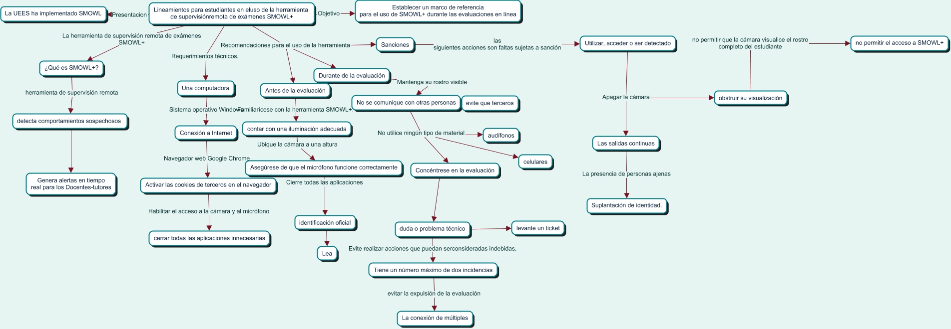Este Cmap, tiene información relacionada con: Lineamientos para estudiantes en el uso de la herramienta de supervisión remota de exámenes SMOWL+, No se comunique con otras personas No utilice ningún tipo de material celulares, Lineamientos para estudiantes en el uso de la herramienta de supervisión remota de exámenes SMOWL+ Recomendaciones para el uso de la herramienta Durante de la evaluación, No se comunique con otras personas No utilice ningún tipo de material audífonos, Concéntrese en la evaluación ???? duda o problema técnico, Tiene un número máximo de dos incidencias evitar la expulsión de la evaluación La conexión de múltiples, Durante de la evaluación Mantenga su rostro visible No se comunique con otras personas, Utilizar, acceder o ser detectado Apagar la cámara obstruir su visualización, No se comunique con otras personas ???? evite que terceros, identificación oficial ???? Lea, Lineamientos para estudiantes en el uso de la herramienta de supervisión remota de exámenes SMOWL+ Presentacion La UEES ha implementado SMOWL, Activar las cookies de terceros en el navegador Habilitar el acceso a la cámara y al micrófono cerrar todas las aplicaciones innecesarias, Sanciones las siguientes acciones son faltas sujetas a sanción Utilizar, acceder o ser detectado, Asegúrese de que el micrófono funcione correctamente Cierre todas las aplicaciones identificación oficial, ¿Qué es SMOWL+? herramienta de supervisión remota detecta comportamientos sospechosos, Lineamientos para estudiantes en el uso de la herramienta de supervisión remota de exámenes SMOWL+ Objetivo Establecer un marco de referencia para el uso de SMOWL+ durante las evaluaciones en línea, contar con una iluminación adecuada Ubique la cámara a una altura Asegúrese de que el micrófono funcione correctamente, No se comunique con otras personas No utilice ningún tipo de material Concéntrese en la evaluación, duda o problema técnico Evite realizar acciones que puedan ser consideradas indebidas, Tiene un número máximo de dos incidencias, obstruir su visualización no permitir que la cámara visualice el rostro completo del estudiante no permitir el acceso a SMOWL+, Utilizar, acceder o ser detectado Apagar la cámara Las salidas continuas