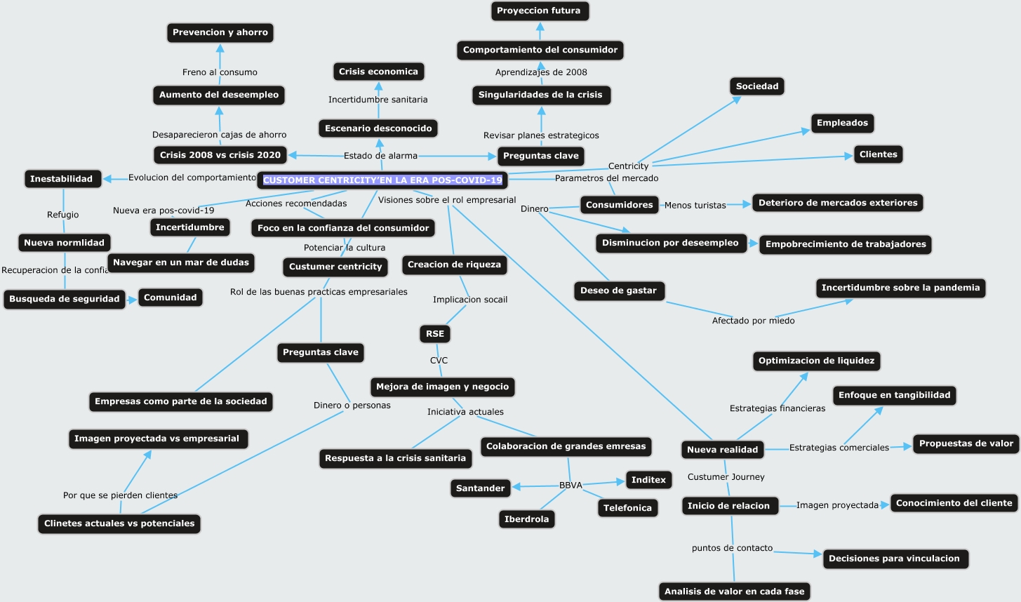 Este Cmap, tiene información relacionada con: CUSTOMER CENTRICTY EN LA ERA POS-COVID-19, CUSTOMER CENTRICITY’ EN LA ERA POS-COVID-19 Centricity Sociedad, Nueva realidad Estrategias comerciales Propuestas de valor, CUSTOMER CENTRICITY’ EN LA ERA POS-COVID-19 Visiones sobre el rol empresarial Creacion de riqueza, CUSTOMER CENTRICITY’ EN LA ERA POS-COVID-19 Acciones recomendadas Foco en la confianza del consumidor, Mejora de imagen y negocio Iniciativa actuales Respuesta a la crisis sanitaria, Nueva normlidad Recuperacion de la confianza Busqueda de seguridad, Singularidades de la crisis Aprendizajes de 2008 Comportamiento del consumidor, CUSTOMER CENTRICITY’ EN LA ERA POS-COVID-19 Rol de las buenas practicas empresariales Preguntas clave, CUSTOMER CENTRICITY’ EN LA ERA POS-COVID-19 Centricity Clientes, Escenario desconocido Incertidumbre sanitaria Crisis economica, Incertidumbre ???? Navegar en un mar de dudas, Clinetes actuales vs potenciales Por que se pierden clientes Imagen proyectada vs empresarial, CUSTOMER CENTRICITY’ EN LA ERA POS-COVID-19 Nueva era pos-covid-19 Incertidumbre, Colaboracion de grandes emresas BBVA Santander, Nueva realidad Custumer Journey Inicio de relacion, Busqueda de seguridad ???? Comunidad, Colaboracion de grandes emresas BBVA Iberdrola, Disminucion por deseempleo ???? Empobrecimiento de trabajadores, Colaboracion de grandes emresas BBVA Inditex, Crisis 2008 vs crisis 2020 Desaparecieron cajas de ahorro Aumento del deseempleo