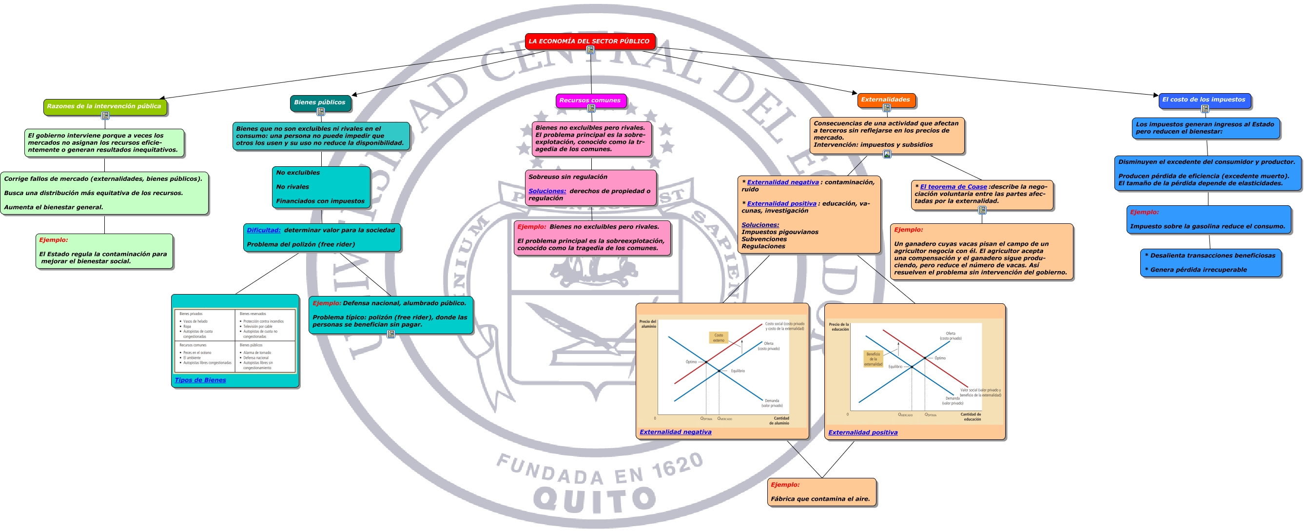 Este Cmap, tiene información relacionada con: LA ECONOMÍA DEL SECTOR PUBLICO, Dificultad: determinar valor para la sociedad Problema del polizón (free rider) Ejemplo:Defensa nacional, alumbrado público. Problema típico: polizón (free rider), donde las personas se benefician sin pagar., *Externalidad negativa: contaminación, ruido *Externalidad positiva: educación, va- cunas, investigación Soluciones: Impuestos pigouvianos Subvenciones Regulaciones Externalidad negativa, Razones de la intervención pública El gobierno interviene porque a veces los mercados no asignan los recursos eficie- ntemente o generan resultados inequitativos., No excluibles No rivales Financiados con impuestos Dificultad: determinar valor para la sociedad Problema del polizón (free rider), Recursos comunes Bienes no excluibles pero rivales. El problema principal es la sobre- explotación, conocido como la tr- agedia de los comunes., Bienes que no son excluibles ni rivales en el consumo: una persona no puede impedir que otros los usen y su uso no reduce la disponibilidad. No excluibles No rivales Financiados con impuestos, Dificultad: determinar valor para la sociedad Problema del polizón (free rider) Tipos de Bienes, Sobreuso sin regulación Soluciones: derechos de propiedad o regulación Ejemplo: Bienes no excluibles pero rivales. El problema principal es la sobreexplotación, conocido como la tragedia de los comunes., Bienes públicos Bienes que no son excluibles ni rivales en el consumo: una persona no puede impedir que otros los usen y su uso no reduce la disponibilidad., Consecuencias de una actividad que afectan a terceros sin reflejarse en los precios de mercado. Intervención: impuestos y subsidios *Externalidad negativa: contaminación, ruido *Externalidad positiva: educación, va- cunas, investigación Soluciones: Impuestos pigouvianos Subvenciones Regulaciones, *Externalidad negativa: contaminación, ruido *Externalidad positiva: educación, va- cunas, investigación Soluciones: Impuestos pigouvianos Subvenciones Regulaciones Externalidad positiva, LA ECONOMÍA DEL SECTOR PÚBLICO Razones de la intervención pública, LA ECONOMÍA DEL SECTOR PÚBLICO Recursos comunes, Los impuestos generan ingresos al Estado pero reducen el bienestar: Disminuyen el excedente del consumidor y productor. Producen pérdida de eficiencia (excedente muerto). El tamaño de la pérdida depende de elasticidades., Disminuyen el excedente del consumidor y productor. Producen pérdida de eficiencia (excedente muerto). El tamaño de la pérdida depende de elasticidades. Ejemplo: Impuesto sobre la gasolina reduce el consumo., Bienes no excluibles pero rivales. El problema principal es la sobre- explotación, conocido como la tr- agedia de los comunes. Sobreuso sin regulación Soluciones: derechos de propiedad o regulación, Corrige fallos de mercado (externalidades, bienes públicos). Busca una distribución más equitativa de los recursos. Aumenta el bienestar general. Ejemplo: El Estado regula la contaminación para mejorar el bienestar social., LA ECONOMÍA DEL SECTOR PÚBLICO Externalidades, Externalidad negativa Ejemplo: Fábrica que contamina el aire., El costo de los impuestos Los impuestos generan ingresos al Estado pero reducen el bienestar: