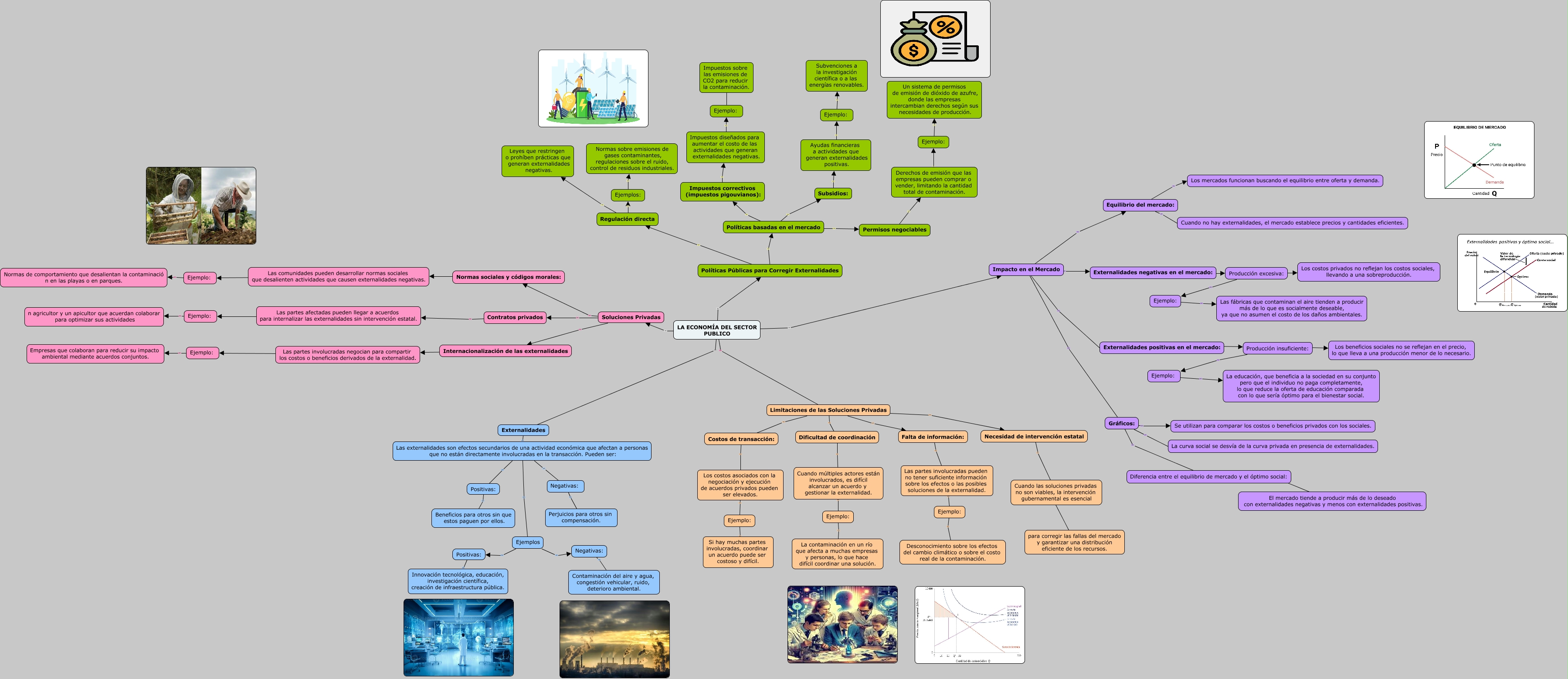 Este Cmap, tiene información relacionada con: LA ECONOMÍA DEL SECTOR PUBLICO.cmap, Regulación directa . Ejemplos:, Cuando múltiples actores están involucrados, es difícil alcanzar un acuerdo y gestionar la externalidad. . Ejemplo:, Cuando las soluciones privadas no son viables, la intervención gubernamental es esencial . para corregir las fallas del mercado y garantizar una distribución eficiente de los recursos., Ejemplo: . Desconocimiento sobre los efectos del cambio climático o sobre el costo real de la contaminación., Ejemplos . Positivas:, Dificultad de coordinación . Cuando múltiples actores están involucrados, es difícil alcanzar un acuerdo y gestionar la externalidad., Contratos privados . Las partes afectadas pueden llegar a acuerdos para internalizar las externalidades sin intervención estatal., Las externalidades son efectos secundarios de una actividad económica que afectan a personas que no están directamente involucradas en la transacción. Pueden ser: . Ejemplos, Producción insuficiente: . Ejemplo:, Impuestos correctivos (impuestos pigouvianos): . Impuestos diseñados para aumentar el costo de las actividades que generan externalidades negativas., Diferencia entre el equilibrio de mercado y el óptimo social: . El mercado tiende a producir más de lo deseado con externalidades negativas y menos con externalidades positivas., Falta de información: . Las partes involucradas pueden no tener suficiente información sobre los efectos o las posibles soluciones de la externalidad., Las partes involucradas pueden no tener suficiente información sobre los efectos o las posibles soluciones de la externalidad. . Ejemplo:, Negativas: . Contaminación del aire y agua, congestión vehicular, ruido, deterioro ambiental., Limitaciones de las Soluciones Privadas . Dificultad de coordinación, Ejemplos: . Normas sobre emisiones de gases contaminantes, regulaciones sobre el ruido, control de residuos industriales., Impacto en el Mercado . Externalidades negativas en el mercado:, Gráficos: . La curva social se desvía de la curva privada en presencia de externalidades., Impacto en el Mercado . Gráficos:, Soluciones Privadas . Normas sociales y códigos morales: