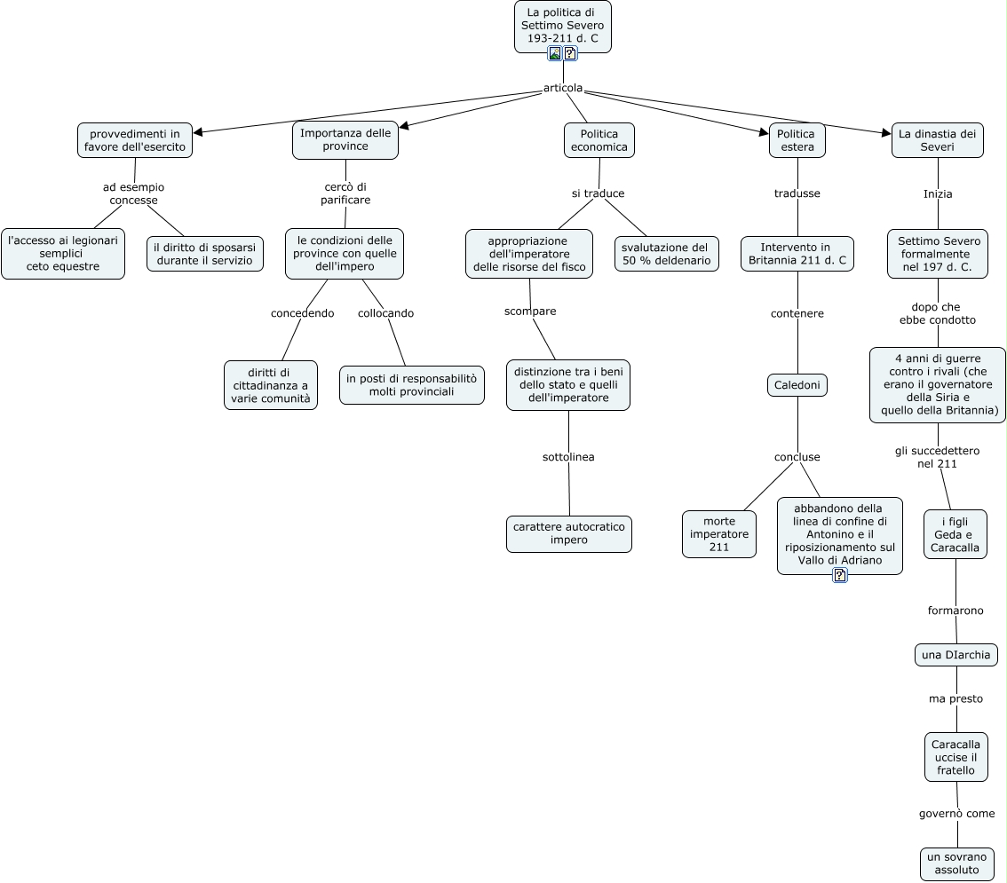 Questa Cmap, creata con IHMC CmapTools, contiene informazioni relative a: Settimo Severo, Caledoni concluse abbandono della linea di confine di Antonino e il riposizionamento sul Vallo di Adriano, le condizioni delle province con quelle dell'impero collocando in posti di responsabilitò molti provinciali, La politica di Settimo Severo 193-211 d. C articola provvedimenti in favore dell'esercito, La politica di Settimo Severo 193-211 d. C articola Politica economica, appropriazione dell'imperatore delle risorse del fisco scompare distinzione tra i beni dello stato e quelli dell'imperatore, Politica economica si traduce svalutazione del 50 % deldenario, Politica economica si traduce appropriazione dell'imperatore delle risorse del fisco, provvedimenti in favore dell'esercito ad esempio concesse il diritto di sposarsi durante il servizio, Caledoni concluse morte imperatore 211, La politica di Settimo Severo 193-211 d. C articola La dinastia dei Severi, i figli Geda e Caracalla formarono una DIarchia, Politica estera tradusse Intervento in Britannia 211 d. C, 4 anni di guerre contro i rivali (che erano il governatore della Siria e quello della Britannia) gli succedettero nel 211 i figli Geda e Caracalla, Importanza delle province cercò di parificare le condizioni delle province con quelle dell'impero, una DIarchia ma presto Caracalla uccise il fratello, La dinastia dei Severi Inizia Settimo Severo formalmente nel 197 d. C., provvedimenti in favore dell'esercito ad esempio concesse l'accesso ai legionari semplici ceto equestre, La politica di Settimo Severo 193-211 d. C articola Politica estera, distinzione tra i beni dello stato e quelli dell'imperatore sottolinea carattere autocratico impero, le condizioni delle province con quelle dell'impero concedendo diritti di cittadinanza a varie comunità