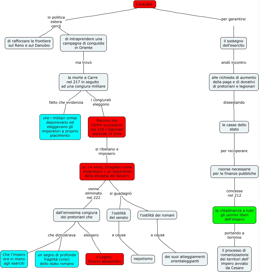 Questa Cmap, creata con IHMC CmapTools, contiene informazioni relative a: L'impero in mano agli eserciti, Macrino ma l'anno successivo nel 218 i legionari stanziati in Siria si ribellano e imposero un 14 enne, Eliogalbo come imperatore ( un esponente della dinastia dei Severi), alle richieste di aumento della paga e di donativi di pretoriani e legionari dissestando le casse dello stato, la morte a Carre nel 217 in seguito ad una congiura militare fatto che evidenzia che i militari ormai deponevano ed eleggevano gli imperatori a proprio piacimento, dall'ennesima congiura dei pretoriani che che dimostrava un segno di profonda fragilità (crisi) dello stato romano, Caracalla in politica estera cercò di rafforzare le frontiere sul Reno e sul Danubio, dall'ennesima congiura dei pretoriani che elessero il cugino Severo alessandro, dall'ennesima congiura dei pretoriani che che dimostrava Che l'impero era in mano agli eserciti, un 14 enne, Eliogalbo come imperatore ( un esponente della dinastia dei Severi) si guadagnò l'ostilità del senato, l'ostilità del senato a causa nepotismo, Caracalla per garantirsi il sostegno dell'esercito, la morte a Carre nel 217 in seguito ad una congiura militare i congiurati eleggono Macrino ma l'anno successivo nel 218 i legionari stanziati in Siria, il sostegno dell'esercito andò incontro alle richieste di aumento della paga e di donativi di pretoriani e legionari, le casse dello stato per recuperare risorse necessarie per le finanze pubbliche, un 14 enne, Eliogalbo come imperatore ( un esponente della dinastia dei Severi) venne eliminato nel 222 dall'ennesima congiura dei pretoriani che, l'ostilità dei romani a causa dei suoi atteggiamenti orientaleggianti, Caracalla in politica estera cercò di intraprendere una campagna di conquiste in Oriente, risorse necessarie per le finanze pubbliche concesse nel 212 la cittadinanza a tutti gli uomini liberi dell'impero, di intraprendere una campagna di conquiste in Oriente ma trovò la morte a Carre nel 217 in seguito ad una congiura militare, la cittadinanza a tutti gli uomini liberi dell'impero portando a termine il processo di romanizzazione dei territori dell' impero avviato da Cesare, un 14 enne, Eliogalbo come imperatore ( un esponente della dinastia dei Severi) si guadagnò l'ostilità dei romani