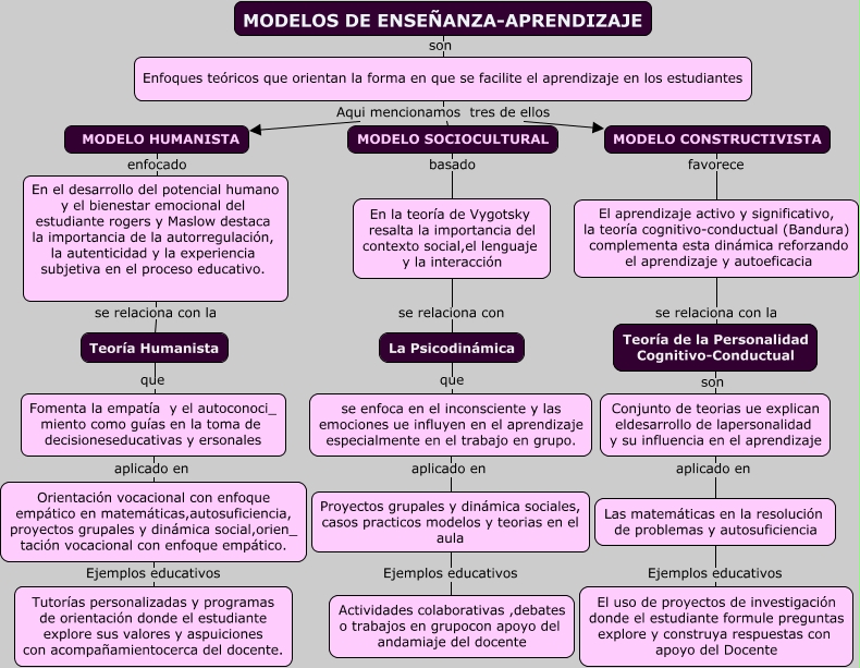 Este Cmap, tiene información relacionada con: PA4 REYNA Y NICOLE PS. INSTRUCCINAL, MODELO CONSTRUCTIVISTA favorece El aprendizaje activo y significativo, la teoría cognitivo-conductual (Bandura) complementa esta dinámica reforzando el aprendizaje y autoeficacia, Teoría Humanista que Fomenta la empatía y el autoconoci_ miento como guías en la toma de decisioneseducativas y ersonales, Proyectos grupales y dinámica sociales, casos practicos modelos y teorias en el aula Ejemplos educativos Actividades colaborativas ,debates o trabajos en grupocon apoyo del andamiaje del docente, Las matemáticas en la resolución de problemas y autosuficiencia Ejemplos educativos El uso de proyectos de investigación donde el estudiante formule preguntas explore y construya respuestas con apoyo del Docente, Enfoques teóricos que orientan la forma en que se facilite el aprendizaje en los estudiantes Aqui mencionamos tres de ellos MODELO SOCIOCULTURAL, Teoría de la Personalidad Cognitivo-Conductual son Conjunto de teorias ue explican eldesarrollo de lapersonalidad y su influencia en el aprendizaje, El aprendizaje activo y significativo, la teoría cognitivo-conductual (Bandura) complementa esta dinámica reforzando el aprendizaje y autoeficacia se relaciona con la Teoría de la Personalidad Cognitivo-Conductual, se enfoca en el inconsciente y las emociones ue influyen en el aprendizaje especialmente en el trabajo en grupo. aplicado en Proyectos grupales y dinámica sociales, casos practicos modelos y teorias en el aula, Fomenta la empatía y el autoconoci_ miento como guías en la toma de decisioneseducativas y ersonales aplicado en Orientación vocacional con enfoque empático en matemáticas,autosuficiencia, proyectos grupales y dinámica social,orien_ tación vocacional con enfoque empático., En el desarrollo del potencial humano y el bienestar emocional del estudiante rogers y Maslow destaca la importancia de la autorregulación, la autenticidad y la experiencia subjetiva en el proceso educativo. se relaciona con la Teoría Humanista, MODELO HUMANISTA enfocado En el desarrollo del potencial humano y el bienestar emocional del estudiante rogers y Maslow destaca la importancia de la autorregulación, la autenticidad y la experiencia subjetiva en el proceso educativo., Enfoques teóricos que orientan la forma en que se facilite el aprendizaje en los estudiantes Aqui mencionamos tres de ellos MODELO HUMANISTA, En la teoría de Vygotsky resalta la importancia del contexto social,el lenguaje y la interacción se relaciona con La Psicodinámica, Conjunto de teorias ue explican eldesarrollo de lapersonalidad y su influencia en el aprendizaje aplicado en Las matemáticas en la resolución de problemas y autosuficiencia, Enfoques teóricos que orientan la forma en que se facilite el aprendizaje en los estudiantes Aqui mencionamos tres de ellos MODELO CONSTRUCTIVISTA, La Psicodinámica que se enfoca en el inconsciente y las emociones ue influyen en el aprendizaje especialmente en el trabajo en grupo., MODELOS DE ENSEÑANZA-APRENDIZAJE son Enfoques teóricos que orientan la forma en que se facilite el aprendizaje en los estudiantes, Orientación vocacional con enfoque empático en matemáticas,autosuficiencia, proyectos grupales y dinámica social,orien_ tación vocacional con enfoque empático. Ejemplos educativos Tutorías personalizadas y programas de orientación donde el estudiante explore sus valores y aspuiciones con acompañamientocerca del docente., MODELO SOCIOCULTURAL basado En la teoría de Vygotsky resalta la importancia del contexto social,el lenguaje y la interacción