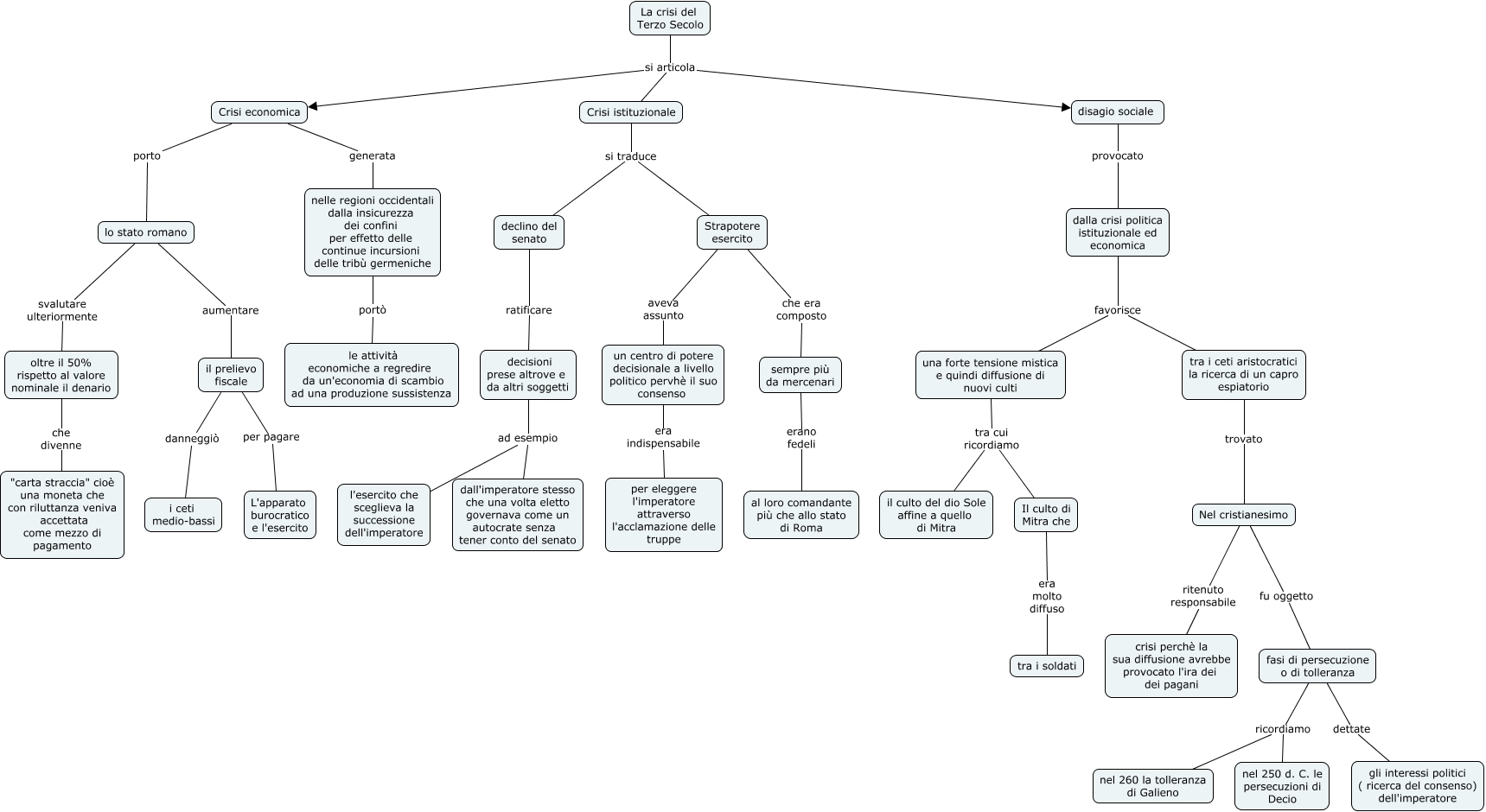 Questa Cmap, creata con IHMC CmapTools, contiene informazioni relative a: La crisi del terzo secolo, declino del senato ratificare decisioni prese altrove e da altri soggetti, fasi di persecuzione o di tolleranza ricordiamo nel 260 la tolleranza di Galieno, Crisi economica generata nelle regioni occidentali dalla insicurezza dei confini per effetto delle continue incursioni delle tribù germeniche, una forte tensione mistica e quindi diffusione di nuovi culti tra cui ricordiamo il culto del dio Sole affine a quello di Mitra, nelle regioni occidentali dalla insicurezza dei confini per effetto delle continue incursioni delle tribù germeniche portò le attività economiche a regredire da un'economia di scambio ad una produzione sussistenza, decisioni prese altrove e da altri soggetti ad esempio l'esercito che sceglieva la successione dell'imperatore, La crisi del Terzo Secolo si articola Crisi economica, Nel cristianesimo ritenuto responsabile crisi perchè la sua diffusione avrebbe provocato l'ira dei dei pagani, Crisi istituzionale si traduce Strapotere esercito, il prelievo fiscale danneggiò i ceti medio-bassi, un centro di potere decisionale a livello politico pervhè il suo consenso era indispensabile per eleggere l'imperatore attraverso l'acclamazione delle truppe, tra i ceti aristocratici la ricerca di un capro espiatorio trovato Nel cristianesimo, Nel cristianesimo fu oggetto fasi di persecuzione o di tolleranza, fasi di persecuzione o di tolleranza ricordiamo nel 250 d. C. le persecuzioni di Decio, Strapotere esercito che era composto sempre più da mercenari, dalla crisi politica istituzionale ed economica favorisce tra i ceti aristocratici la ricerca di un capro espiatorio, fasi di persecuzione o di tolleranza dettate gli interessi politici ( ricerca del consenso) dell'imperatore, dalla crisi politica istituzionale ed economica favorisce una forte tensione mistica e quindi diffusione di nuovi culti, Crisi istituzionale si traduce declino del senato, il prelievo fiscale per pagare L'apparato burocratico e l'esercito