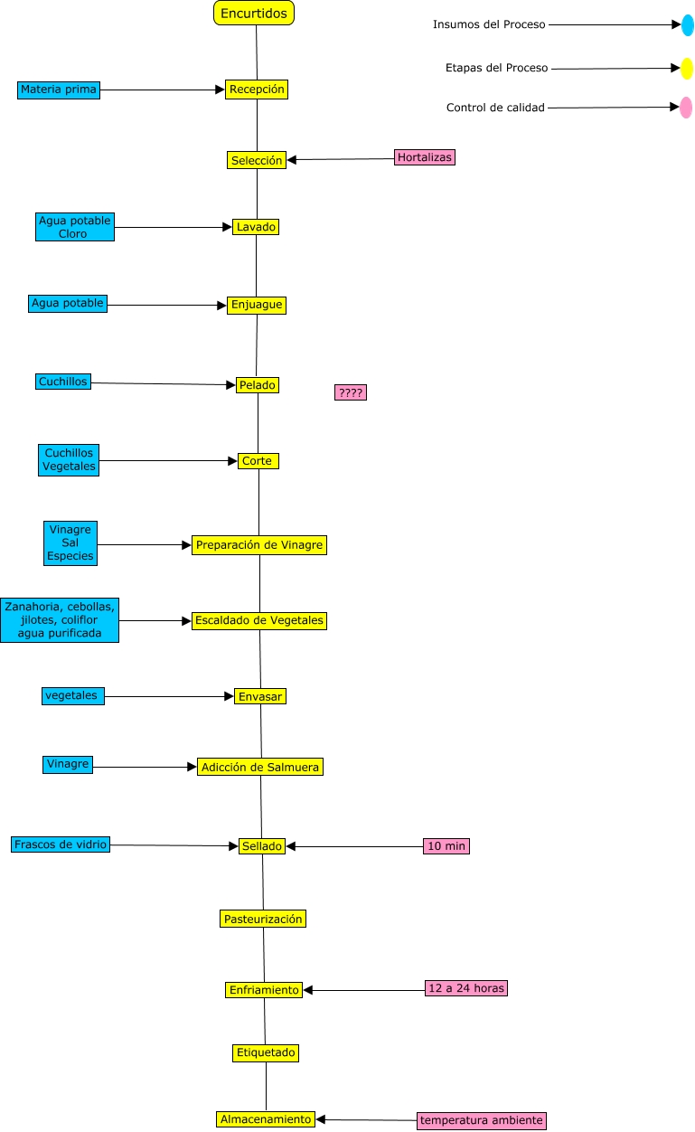 Este Cmap, tiene información relacionada con: flujograma de encurtidos, Agua potable Cloro ???? Lavado, 10 min ???? Sellado, Escaldado de Vegetales ???? Envasar, Etapas del Proceso ????, Frascos de vidrio ???? Sellado, Vinagre Sal Especies ???? Preparación de Vinagre, Encurtidos ???? Recepción, Envasar ???? Adicción de Salmuera, Cuchillos ???? Pelado, Vinagre ???? Adicción de Salmuera, Adicción de Salmuera ???? Sellado, Lavado ???? Enjuague, Pasteurización ???? Enfriamiento, Agua potable ???? Enjuague, Control de calidad ????, Etiquetado ???? Almacenamiento, Cuchillos Vegetales ???? Corte, Hortalizas ???? Selección, Insumos del Proceso ????, 12 a 24 horas ???? Enfriamiento