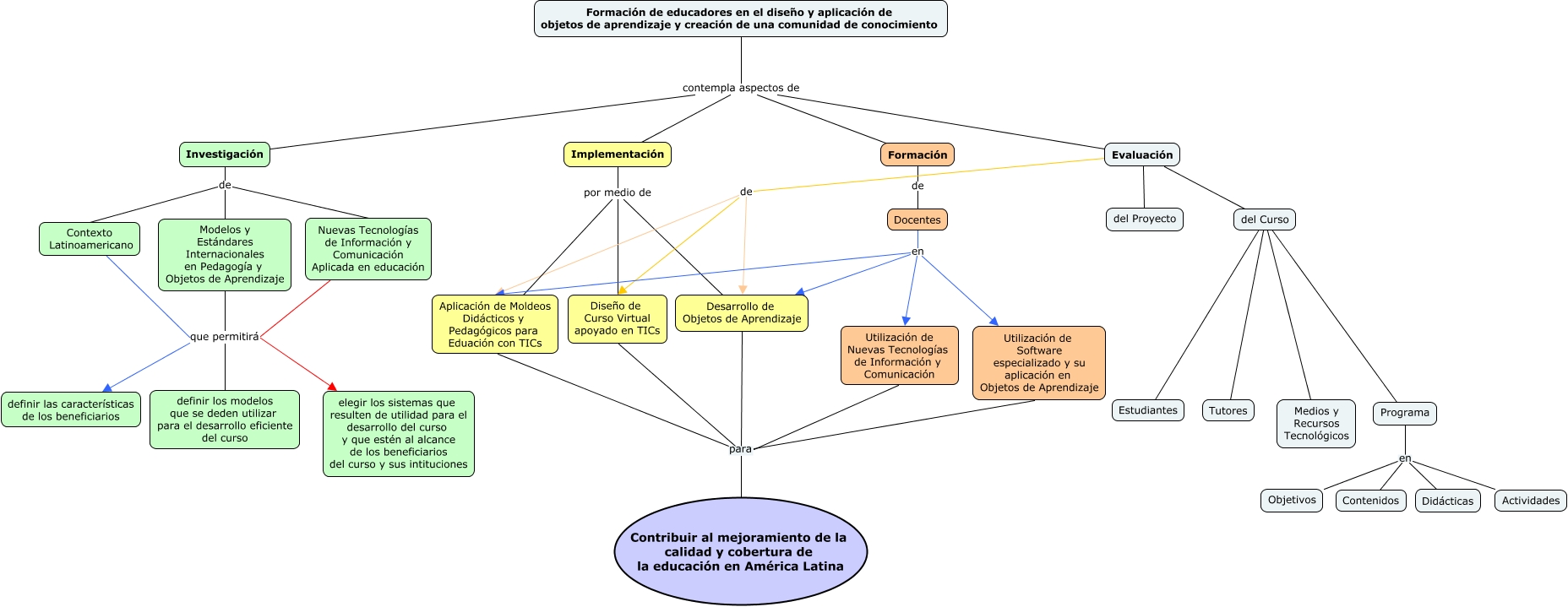 Este Cmap, tiene información relacionada con: MAPA PROYECTO OA 2, Formación de educadores en el diseño y aplicación de objetos de aprendizaje y creación de una comunidad de conocimiento contempla aspectos de Formación, Investigación de Nuevas Tecnologías de Información y Comunicación Aplicada en educación, Contexto Latinoamericano que permitirá definir los modelos que se deden utilizar para el desarrollo eficiente del curso, del Curso Medios y Recursos Tecnológicos, Nuevas Tecnologías de Información y Comunicación Aplicada en educación que permitirá definir los modelos que se deden utilizar para el desarrollo eficiente del curso, Formación de educadores en el diseño y aplicación de objetos de aprendizaje y creación de una comunidad de conocimiento contempla aspectos de Evaluación, Implementación por medio de Diseño de Curso Virtual apoyado en TICs, Nuevas Tecnologías de Información y Comunicación Aplicada en educación que permitirá definir las características de los beneficiarios, Docentes en Utilización de Software especializado y su aplicación en Objetos de Aprendizaje, Modelos y Estándares Internacionales en Pedagogía y Objetos de Aprendizaje que permitirá elegir los sistemas que resulten de utilidad para el desarrollo del curso y que estén al alcance de los beneficiarios del curso y sus intituciones, Evaluación de Diseño de Curso Virtual apoyado en TICs, Formación de educadores en el diseño y aplicación de objetos de aprendizaje y creación de una comunidad de conocimiento contempla aspectos de Investigación, Formación de Docentes, Evaluación de Aplicación de Moldeos Didácticos y Pedagógicos para Eduación con TICs, Investigación de Contexto Latinoamericano, Evaluación del Proyecto, Aplicación de Moldeos Didácticos y Pedagógicos para Eduación con TICs para Contribuir al mejoramiento de la calidad y cobertura de la educación en América Latina, Utilización de Software especializado y su aplicación en Objetos de Aprendizaje para Contribuir al mejoramiento de la calidad y cobertura de la educación en América Latina, Implementación por medio de Aplicación de Moldeos Didácticos y Pedagógicos para Eduación con TICs, Docentes en Desarrollo de Objetos de Aprendizaje