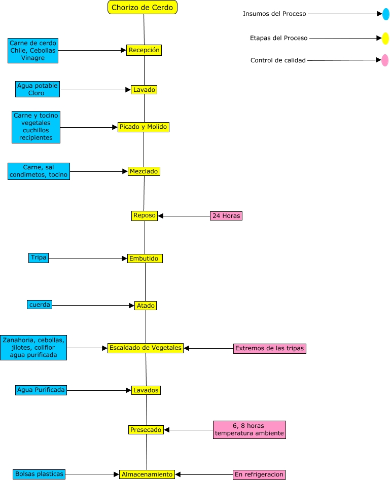 Este Cmap, tiene información relacionada con: flujograma de Chorizo, Carne y tocino vegetales cuchillos recipientes ???? Picado y Molido, Control de calidad ????, Carne, sal condimetos, tocino ???? Mezclado, Recepción ???? Picado y Molido, Atado ???? Escaldado de Vegetales, Reposo ???? Embutido, Insumos del Proceso ????, Chorizo de Cerdo ???? Recepción, Extremos de las tripas ???? Escaldado de Vegetales, Etapas del Proceso ????, Picado y Molido ???? Mezclado, Agua potable Cloro ???? Lavado, cuerda ???? Atado, Bolsas plasticas ???? Almacenamiento, 6, 8 horas temperatura ambiente ???? Presecado, Mezclado ???? Reposo, 24 Horas ???? Reposo, Agua Purificada ???? Lavados, Embutido ???? Atado, Presecado ???? Almacenamiento