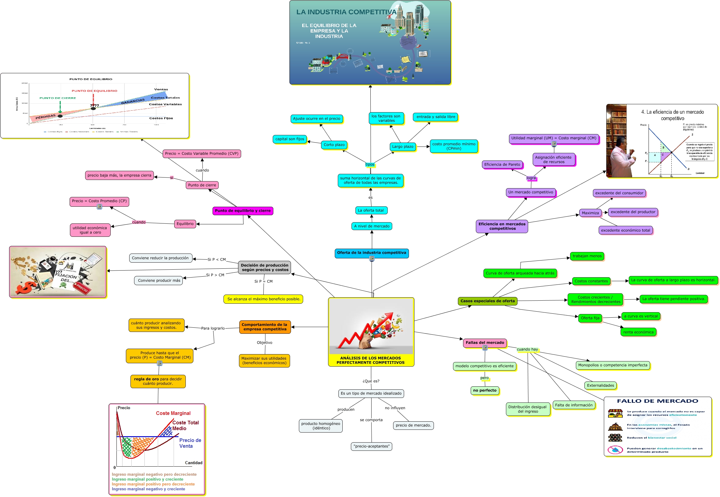 Este Cmap, tiene información relacionada con: Analisis de los mercados perfectamente competitivos, Largo plazo entrada y salida libre, Un mercado competitivo logra Eficiencia de Pareto, Punto de equilibrio y cierre ????, Es un tipo de mercado idealizado no influyen precio de mercado., Largo plazo los factores son variables, Punto de equilibrio y cierre Punto de cierre, Oferta fija a curva es vertical, Casos especiales de oferta Curva de oferta arqueada hacia atrás, Casos especiales de oferta Oferta fija, Decisión de producción según precios y costos Si P < CM Conviene reducir la producción, Decisión de producción según precios y costos ????, ANÁLISIS DE LOS MERCADOS PERFECTAMENTE COMPETITIVOS Casos especiales de oferta, Oferta de la industria competitiva A nivel de mercado, Un mercado competitivo logra Asignación eficiente de recursos, Corto plazo Ajuste ocurre en el precio, Es un tipo de mercado idealizado producen producto homogéneo (idéntico), Punto de cierre si precio baja más, la empresa cierra, Eficiencia en mercados competitivos Maximiza, suma horizontal de las curvas de oferta de todas las empresas., Eficiencia en mercados competitivos Un mercado competitivo