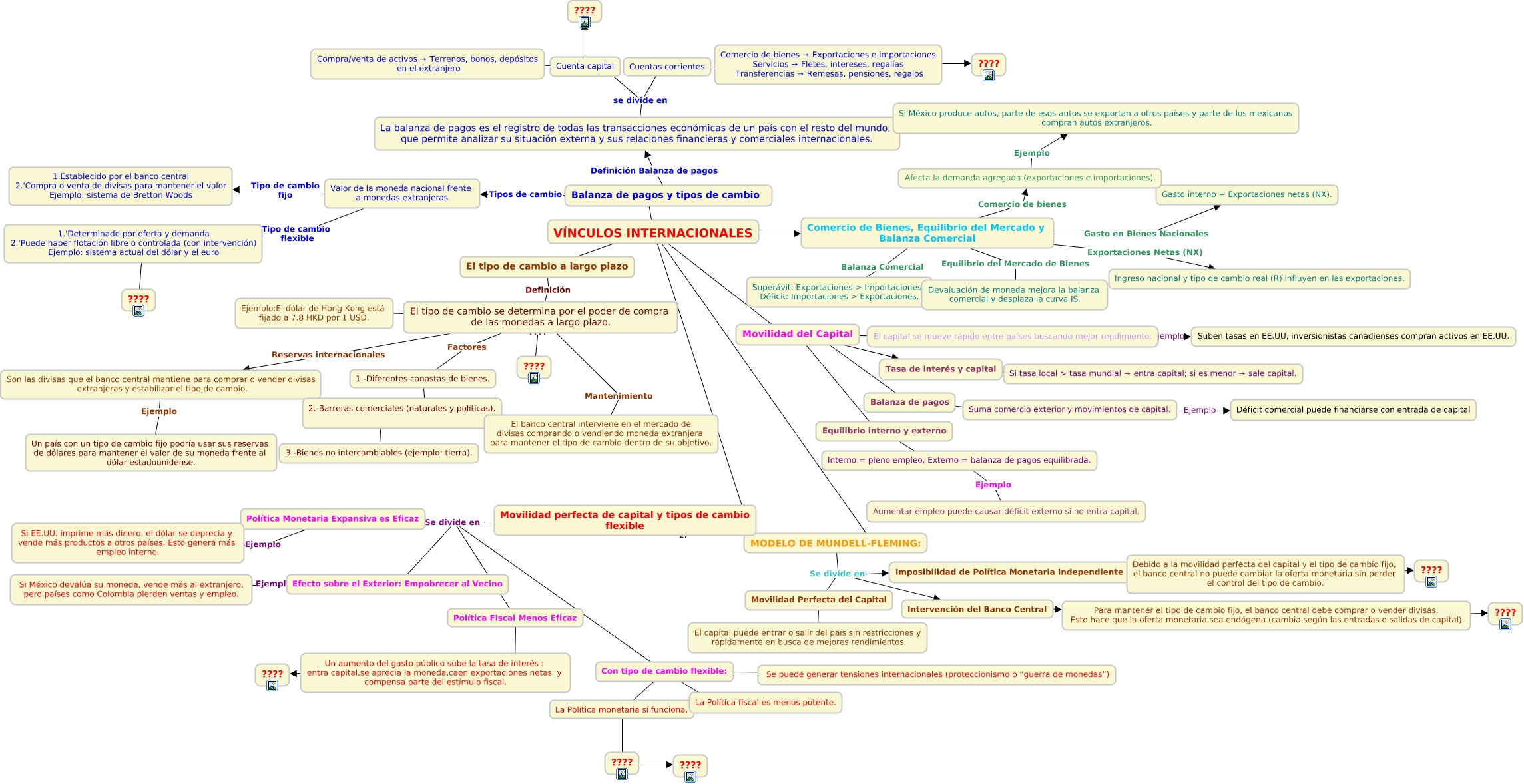 This Concept Map, created with IHMC CmapTools, has information related to: Capitulo-Vínculos Internacionales, Movilidad perfecta de capital y tipos de cambio flexible Se divide en Con tipo de cambio flexible:, MODELO DE MUNDELL-FLEMING: Se divide en Imposibilidad de Política Monetaria Independiente, Movilidad del Capital ???? Equilibrio interno y externo, Comercio de Bienes, Equilibrio del Mercado y Balanza Comercial Comercio de bienes Afecta la demanda agregada (exportaciones e importaciones)., La balanza de pagos es el registro de todas las transacciones económicas de un país con el resto del mundo, que permite analizar su situación externa y sus relaciones financieras y comerciales internacionales. se divide en Cuentas corrientes, Con tipo de cambio flexible: ???? La Política fiscal es menos potente., Un aumento del gasto público sube la tasa de interés : entra capital,se aprecia la moneda,caen exportaciones netas y compensa parte del estímulo fiscal. ???? ????, 1.-Diferentes canastas de bienes. 2.-Barreras comerciales (naturales y políticas)., Con tipo de cambio flexible: ???? Se puede generar tensiones internacionales (proteccionismo o “guerra de monedas�?), Debido a la movilidad perfecta del capital y el tipo de cambio fijo, el banco central no puede cambiar la oferta monetaria sin perder el control del tipo de cambio. ???? ????, Intervención del Banco Central ???? Para mantener el tipo de cambio fijo, el banco central debe comprar o vender divisas. Esto hace que la oferta monetaria sea endógena (cambia según las entradas o salidas de capital)., Valor de la moneda nacional frente a monedas extranjeras Tipo de cambio fijo 1.Establecido por el banco central 2.'Compra o venta de divisas para mantener el valor Ejemplo: sistema de Bretton Woods, Suma comercio exterior y movimientos de capital. Ejemplo Déficit comercial puede financiarse con entrada de capital, Cuenta capital ???? Compra/venta de activos → Terrenos, bonos, depósitos en el extranjero, Movilidad perfecta de capital y tipos de cambio flexible Se divide en Efecto sobre el Exterior: Empobrecer al Vecino, Con tipo de cambio flexible: ???? La Política monetaria sí funciona., La balanza de pagos es el registro de todas las transacciones económicas de un país con el resto del mundo, que permite analizar su situación externa y sus relaciones financieras y comerciales internacionales. se divide en Cuenta capital, Son las divisas que el banco central mantiene para comprar o vender divisas extranjeras y estabilizar el tipo de cambio. Ejemplo Un país con un tipo de cambio fijo podría usar sus reservas de dólares para mantener el valor de su moneda frente al dólar estadounidense., MODELO DE MUNDELL-FLEMING: Se divide en Intervención del Banco Central, Balanza de pagos ???? Suma comercio exterior y movimientos de capital.