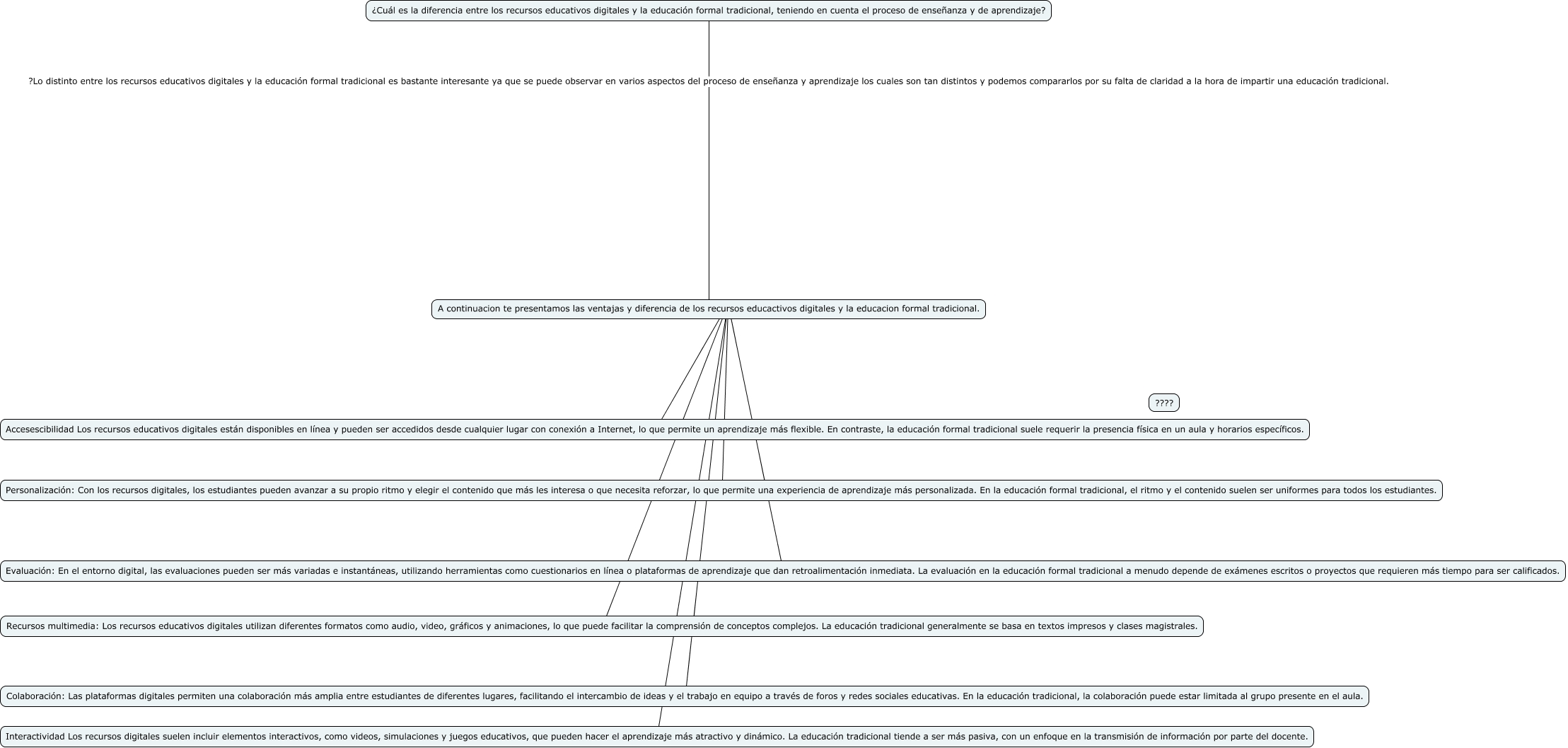 Este Cmap, tiene información relacionada con: Recursos Educativos Digitales, ¿Cuál es la diferencia entre los recursos educativos digitales y la educación formal tradicional, teniendo en cuenta el proceso de enseñanza y de aprendizaje? ?Lo distinto entre los recursos educativos digitales y la educación formal tradicional es bastante interesante ya que se puede observar en varios aspectos del proceso de enseñanza y aprendizaje los cuales son tan distintos y podemos compararlos por su falta de claridad a la hora de impartir una educación tradicional. A continuacion te presentamos las ventajas y diferencia de los recursos educactivos digitales y la educacion formal tradicional., A continuacion te presentamos las ventajas y diferencia de los recursos educactivos digitales y la educacion formal tradicional. ???? Evaluación: En el entorno digital, las evaluaciones pueden ser más variadas e instantáneas, utilizando herramientas como cuestionarios en línea o plataformas de aprendizaje que dan retroalimentación inmediata. La evaluación en la educación formal tradicional a menudo depende de exámenes escritos o proyectos que requieren más tiempo para ser calificados., A continuacion te presentamos las ventajas y diferencia de los recursos educactivos digitales y la educacion formal tradicional. ???? Personalización: Con los recursos digitales, los estudiantes pueden avanzar a su propio ritmo y elegir el contenido que más les interesa o que necesita reforzar, lo que permite una experiencia de aprendizaje más personalizada. En la educación formal tradicional, el ritmo y el contenido suelen ser uniformes para todos los estudiantes., A continuacion te presentamos las ventajas y diferencia de los recursos educactivos digitales y la educacion formal tradicional. ???? Recursos multimedia: Los recursos educativos digitales utilizan diferentes formatos como audio, video, gráficos y animaciones, lo que puede facilitar la comprensión de conceptos complejos. La educación tradicional generalmente se basa en textos impresos y clases magistrales., A continuacion te presentamos las ventajas y diferencia de los recursos educactivos digitales y la educacion formal tradicional. ???? Accesescibilidad Los recursos educativos digitales están disponibles en línea y pueden ser accedidos desde cualquier lugar con conexión a Internet, lo que permite un aprendizaje más flexible. En contraste, la educación formal tradicional suele requerir la presencia física en un aula y horarios específicos., A continuacion te presentamos las ventajas y diferencia de los recursos educactivos digitales y la educacion formal tradicional. ???? Interactividad Los recursos digitales suelen incluir elementos interactivos, como videos, simulaciones y juegos educativos, que pueden hacer el aprendizaje más atractivo y dinámico. La educación tradicional tiende a ser más pasiva, con un enfoque en la transmisión de información por parte del docente., A continuacion te presentamos las ventajas y diferencia de los recursos educactivos digitales y la educacion formal tradicional. ???? Colaboración: Las plataformas digitales permiten una colaboración más amplia entre estudiantes de diferentes lugares, facilitando el intercambio de ideas y el trabajo en equipo a través de foros y redes sociales educativas. En la educación tradicional, la colaboración puede estar limitada al grupo presente en el aula.