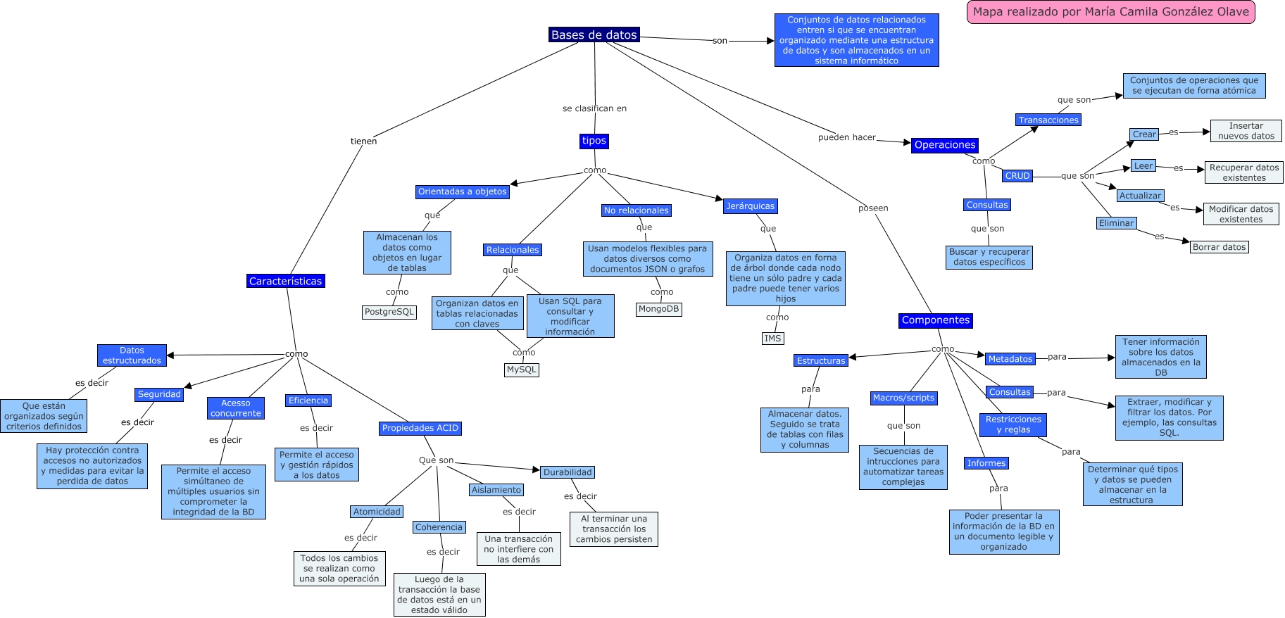 Este Cmap, tiene información relacionada con: Bases de datos, Metadatos para Tener información sobre los datos almacenados en la DB, Leer es Recuperar datos existentes, Estructuras para Almacenar datos. Seguido se trata de tablas con filas y columnas, Bases de datos se clasifican en tipos, Datos estructurados es decir Que están organizados según criterios definidos, No relacionales que Usan modelos flexibles para datos diversos como documentos JSON o grafos, tipos como No relacionales, Informes para Poder presentar la información de la BD en un documento legible y organizado, Organizan datos en tablas relacionadas con claves como MySQL, Componentes como Macros/scripts, Componentes como Estructuras, Operaciones como Transacciones, Operaciones como Consultas, Almacenan los datos como objetos en lugar de tablas como PostgreSQL, Características como Propiedades ACID, Restricciones y reglas para Determinar qué tipos y datos se pueden almacenar en la estructura, Aislamiento es decir Una transacción no interfiere con las demás, Usan SQL para consultar y modificar información como MySQL, Propiedades ACID Que son Coherencia, Componentes como Metadatos