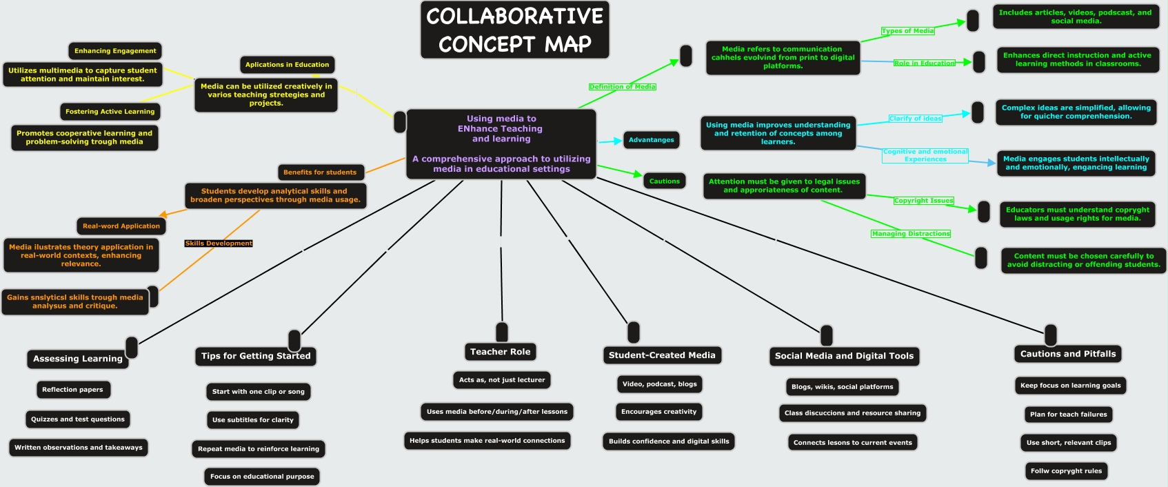 Este Cmap, tiene información relacionada con: ejemplo, Using media to ENhance Teaching and learning A comprehensive approach to utilizing media in educational settings, Using media to ENhance Teaching and learning A comprehensive approach to utilizing media in educational settings, Using media to ENhance Teaching and learning A comprehensive approach to utilizing media in educational settings ? Cautions, Students develop analytical skills and broaden perspectives through media usage. ???? Real-word Application, Using media to ENhance Teaching and learning A comprehensive approach to utilizing media in educational settings Definition of Media, Media refers to communication cahhels evolvind from print to digital platforms. Role in Education, Media can be utilized creatively in varios teaching stretegies and projects. ???? Enhancing Engagement, Students develop analytical skills and broaden perspectives through media usage. Skills Development, Using media to ENhance Teaching and learning A comprehensive approach to utilizing media in educational settings Benefits for students, Using media improves understanding and retention of concepts among learners. Cognitive and emotional Experiences Media engages students intellectually and emotionally, engancing learning, Using media improves understanding and retention of concepts among learners. Clarify of ideas, Media refers to communication cahhels evolvind from print to digital platforms. Types of Media, Using media to ENhance Teaching and learning A comprehensive approach to utilizing media in educational settings ???? Advantanges, Using media to ENhance Teaching and learning A comprehensive approach to utilizing media in educational settings, Attention must be given to legal issues and approriateness of content. Managing Distractions, Attention must be given to legal issues and approriateness of content. Copyright Issues, Media can be utilized creatively in varios teaching stretegies and projects. ???? Fostering Active Learning, Using media to ENhance Teaching and learning A comprehensive approach to utilizing media in educational settings, Aplications in Education, Using media to ENhance Teaching and learning A comprehensive approach to utilizing media in educational settings