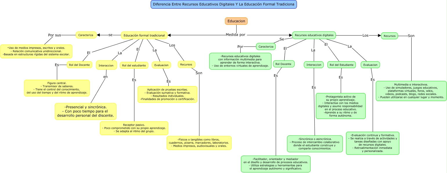 Este Cmap, tiene información relacionada con: Entregable 1, Recursos educativos digitales El Rol Docente, Evaluacion Es -Evaluación continua y formativa. - Se realiza a través de actividades y tareas diseñadas con apoyo de recursos digitales. - Retroalimentación inmediata y personalizada., Educacion Medida por Educación formal tradicional, Recursos educativos digitales Se Caracteriza, Educacion Medida por Recursos educativos digitales, Educación formal tradicional El Rol del Docente, Caracteriza Por -Recursos educativos digitales con información multimedia para aprender de forma interactiva. - Uso de entornos virtuales de aprendizaje., Recursos educativos digitales La Interaccion, Rol del Docente Es Figura central. - Transmisor de saberes. - Tiene el control del conocimiento, del uso del tiempo y del ritmo de aprendizaje., Recursos Son Multimedia e interactivos. - Uso de simuladores, juegos educativos, plataformas virtuales, foros, wikis, videos, podcasts, blogs, redes sociales. - Pueden utilizarse en cualquier lugar y momento., Educación formal tradicional se Caracteriza, Educación formal tradicional La Evaluacion, Evaluacion Es Aplicación de pruebas escritas. - Evaluación sumativa y formativa. - Resultados individuales. -Finalidades de promoción o certificación., Interaccion en -Presencial y sincrónica. - Con poco tiempo para el desarrollo personal del discente., Educación formal tradicional El Rol del estudiante, Recursos educativos digitales La Evaluacion, Interaccion Es -Sincrónica o asincrónica. - Proceso de intercambio colaborativo donde el estudiante construye y comparte conocimientos., Recursos educativos digitales El Rol del Estudiante, Rol del Estudiante Es -Protagonista activo de su propio aprendizaje. - Interactúa con los medios digitales y asume responsabilidad en el proceso educativo. -Aprende a su ritmo y de forma autónoma., Caracteriza Por sus -Uso de medios impresos, escritos y orales. - Relación comunicativa unidireccional. -Basada en estructuras rígidas del sistema escolar.