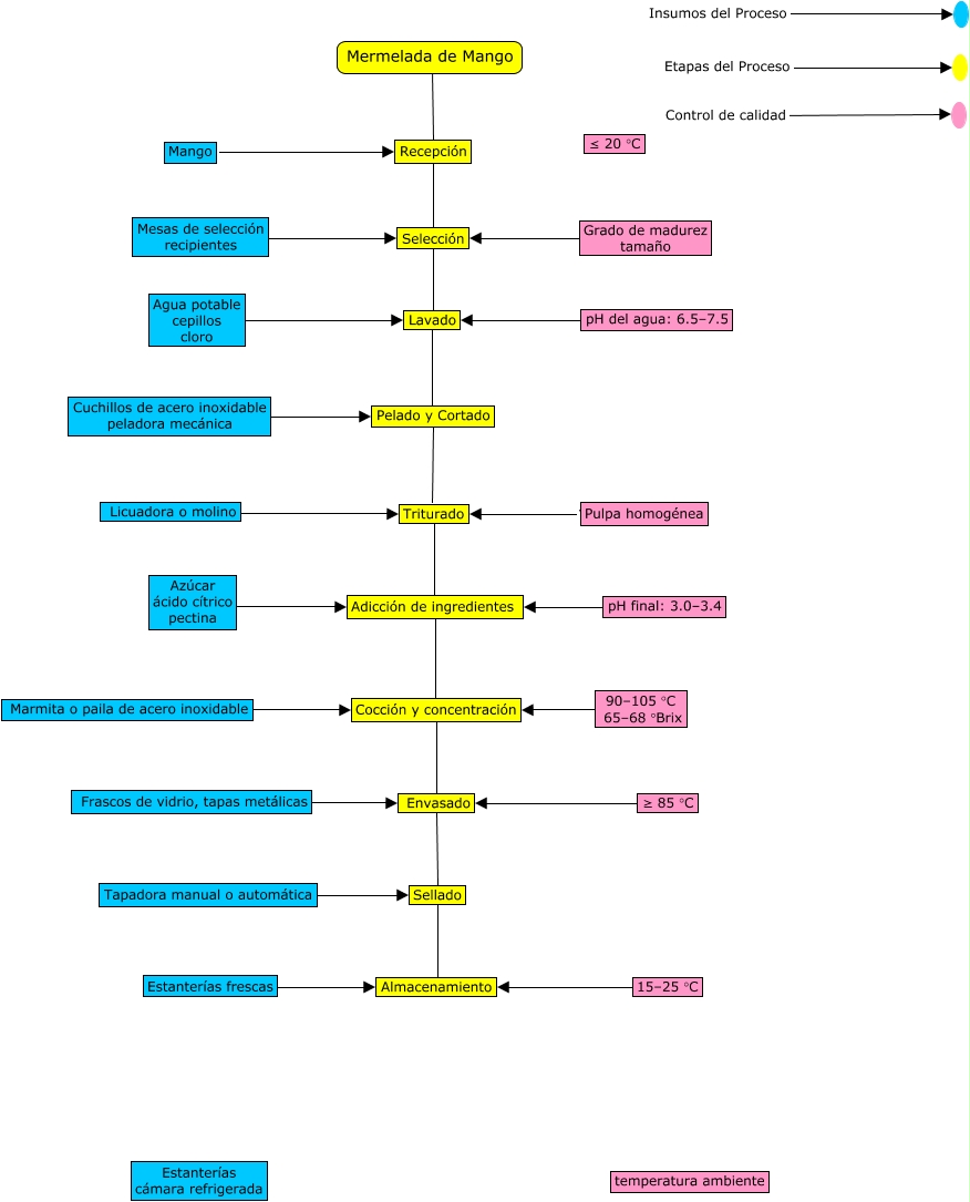 Este Cmap, tiene información relacionada con: flujograma de salsa de tomate, Pulpa homogénea ???? Triturado, Azúcar ácido cítrico pectina ???? Adicción de ingredientes, Cuchillos de acero inoxidable peladora mecánica ???? Pelado y Cortado, 15–25 °C ???? Almacenamiento, Envasado ???? Sellado, Mermelada de Mango ???? Recepción, Frascos de vidrio, tapas metálicas ???? Envasado, pH final: 3.0–3.4 ???? Adicción de ingredientes, Tapadora manual o automática ???? Sellado, Mango ???? Recepción, Adicción de ingredientes ???? Cocción y concentración, Control de calidad ????, 90–105 °C 65–68 °Brix ???? Cocción y concentración, Marmita o paila de acero inoxidable ???? Cocción y concentración, Lavado ???? Pelado y Cortado, Agua potable cepillos cloro ???? Lavado, pH del agua: 6.5–7.5 ???? Lavado, Mesas de selección recipientes ???? Selección, Pelado y Cortado ???? Triturado, Etapas del Proceso ????