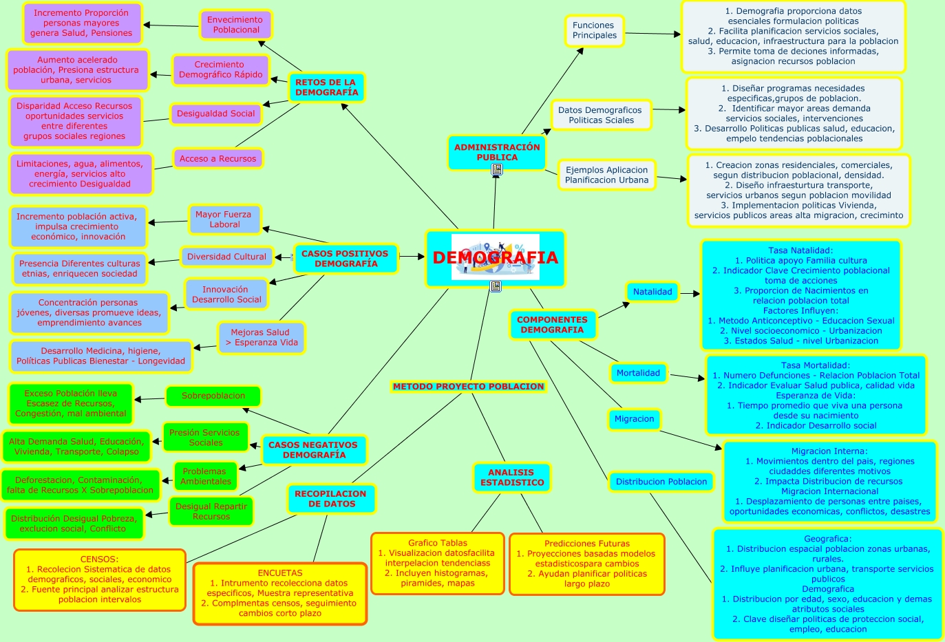 Este Cmap, tiene información relacionada con: DEMOGRAFIA 290, Crecimiento Demográfico Rápido ???? Aumento acelerado población, Presiona estructura urbana, servicios, Mayor Fuerza Laboral ???? Incremento población activa, impulsa crecimiento económico, innovación, Funciones Principales ???? 1. Demografia proporciona datos esenciales formulacion politicas 2. Facilita planificacion servicios sociales, salud, educacion, infraestructura para la poblacion 3. Permite toma de deciones informadas, asignacion recursos poblacion, Datos Demograficos Politicas Sciales ???? 1. Diseñar programas necesidades especificas,grupos de poblacion. 2. Identificar mayor areas demanda servicios sociales, intervenciones 3. Desarrollo Politicas publicas salud, educacion, empelo tendencias poblacionales, CASOS POSITIVOS DEMOGRAFÍA ???? Diversidad Cultural, Presión Servicios Sociales ???? Alta Demanda Salud, Educación, Vivienda, Transporte, Colapso, CASOS POSITIVOS DEMOGRAFÍA ???? Innovación Desarrollo Social, Desigualdad Social ???? Disparidad Acceso Recursos oportunidades servicios entre diferentes grupos sociales regiones, COMPONENTES DEMOGRAFIA ???? Distribucion Poblacion, Distribucion Poblacion ???? Geografica: 1. Distribucion espacial poblacion zonas urbanas, rurales. 2. Influye planificacion urbana, transporte servicios publicos Demografica 1. Distribucion por edad, sexo, educacion y demas atributos sociales 2. Clave diseñar politicas de proteccion social, empleo, educacion, DEMOGRAFIA METODO PROYECTO POBLACION RECOPILACION DE DATOS, Natalidad ???? Tasa Natalidad: 1. Politica apoyo Familia cultura 2. Indicador Clave Crecimiento poblacional toma de acciones 3. Proporcion de Nacimientos en relacion poblacion total Factores Influyen: 1. Metodo Anticonceptivo - Educacion Sexual 2. Nivel socioeconomico - Urbanizacion 3. Estados Salud - nivel Urbanizacion, DEMOGRAFIA ???? COMPONENTES DEMOGRAFIA, ADMINISTRACIÓN PUBLICA ???? Funciones Principales, COMPONENTES DEMOGRAFIA Mortalidad, RETOS DE LA DEMOGRAFÍA ??? Envecimiento Poblacional, COMPONENTES DEMOGRAFIA ???? Migracion, Migracion ???? Migracion Interna: 1. Movimientos dentro del pais, regiones ciudaddes diferentes motivos 2. Impacta Distribucion de recursos Migracion Internacional 1. Desplazamiento de personas entre paises, oportunidades economicas, conflictos, desastres, CASOS NEGATIVOS DEMOGRAFÍA ???? Desigual Repartir Recursos, DEMOGRAFIA ???? CASOS NEGATIVOS DEMOGRAFÍA