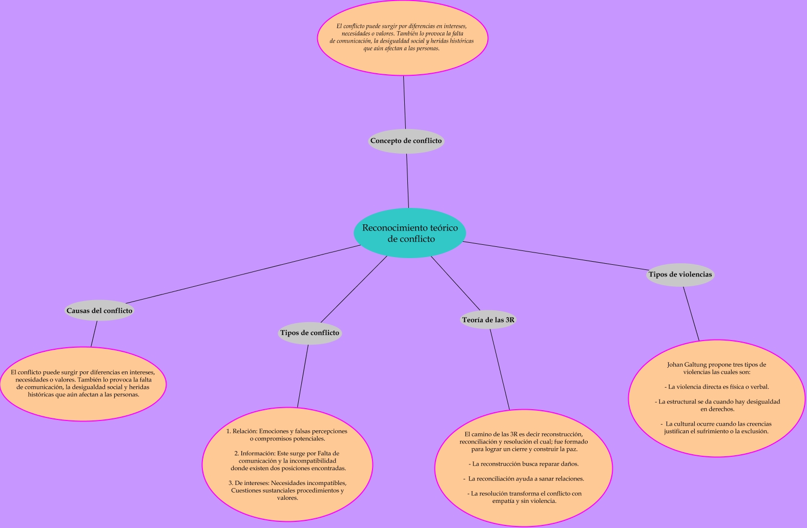 Este Cmap, tiene información relacionada con: conflicto, Reconocimiento teórico de conflicto Tipos de violencias Johan Galtung propone tres tipos de violencias las cuales son: - La violencia directa es física o verbal. - La estructural se da cuando hay desigualdad en derechos. - La cultural ocurre cuando las creencias justifican el sufrimiento o la exclusión., Reconocimiento teórico de conflicto Concepto de conflicto El conflicto puede surgir por diferencias en intereses, necesidades o valores. También lo provoca la falta de comunicación, la desigualdad social y heridas históricas que aún afectan a las personas., Reconocimiento teórico de conflicto Teoría de las 3R El camino de las 3R es decir reconstrucción, reconciliación y resolución el cual; fue formado para lograr un cierre y construir la paz. - La reconstrucción busca reparar daños. - La reconciliación ayuda a sanar relaciones. - La resolución transforma el conflicto con empatía y sin violencia., Reconocimiento teórico de conflicto Tipos de conflicto 1. Relación: Emociones y falsas percepciones o compromisos potenciales. 2. Información: Este surge por Falta de comunicación y la incompatibilidad donde existen dos posiciones encontradas. 3. De intereses: Necesidades incompatibles, Cuestiones sustanciales procedimientos y valores., Reconocimiento teórico de conflicto Causas del conflicto El conflicto puede surgir por diferencias en intereses, necesidades o valores. También lo provoca la falta de comunicación, la desigualdad social y heridas históricas que aún afectan a las personas.